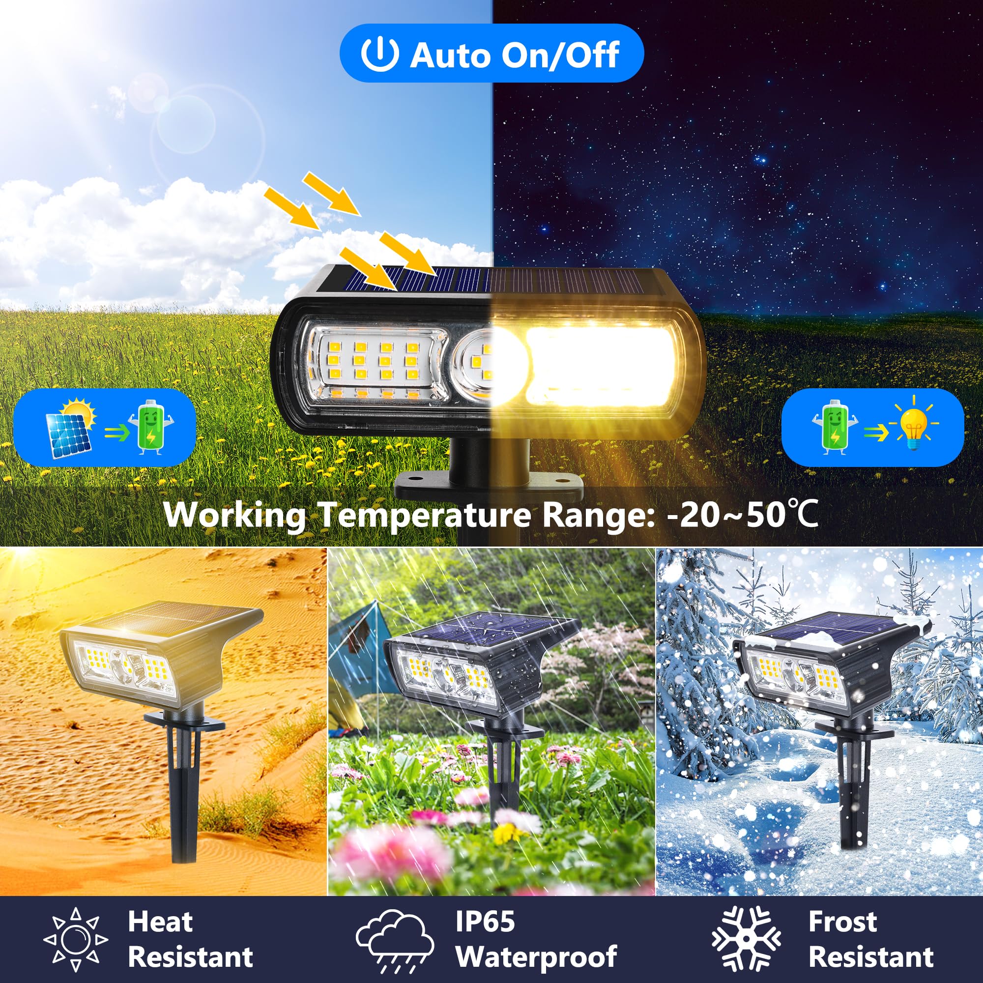 �[Lampy solarne do ogrodu na zewnątrz]Te lampy solarne do ogrodu na zewnątrz mają 28 jaśniejszych diod LED i doskonałą wydajność oraz pojemność baterii. Dzięki efektywnej konwersji mogą działać od 8 do 18 godzin po pełnym naładowaniu. Reflektory solarne na zewnątrz mogą być używane do oświetlania drzew, krzewów, podwórka, ścieżki, ogrodu itp.