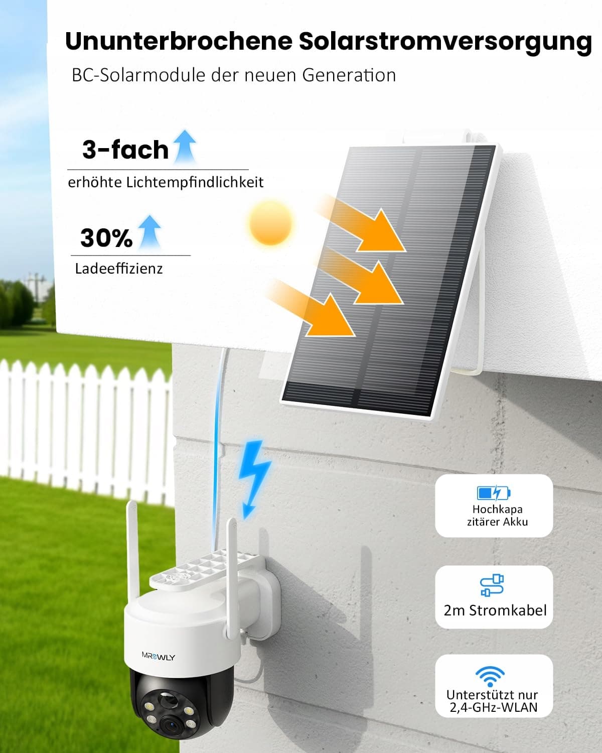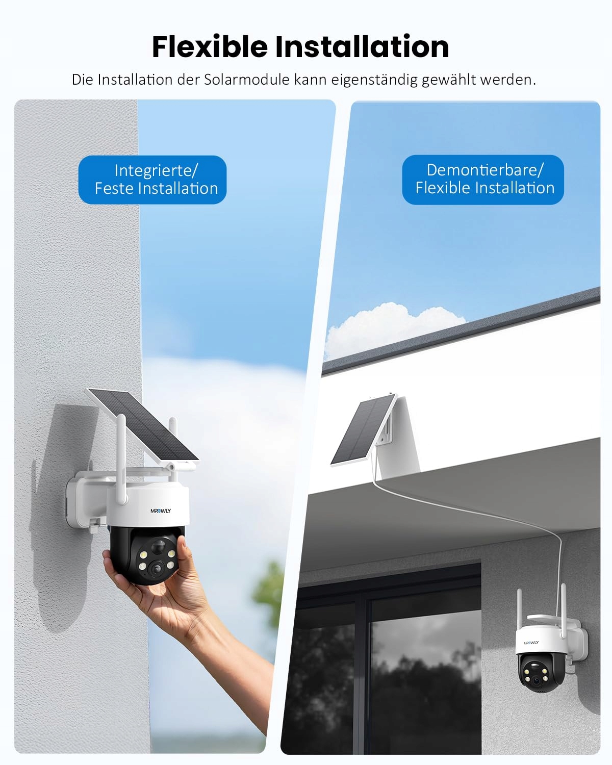 【Zintegrowane lub odłączane panele】Panele słoneczne Mrowly mogą być zainstalowane jako jednostki zintegrowane lub osobno. Kamera solarna zapewnia wystarczające zasilanie i jednocześnie może być ustawiona pod optymalnym kątem widzenia dla kompleksowego pokrycia monitoringu. Zwiększa to znacznie żywotność i niezawodność kamery solarnej WLAN, a jednocześnie upraszcza instalację i konserwację.