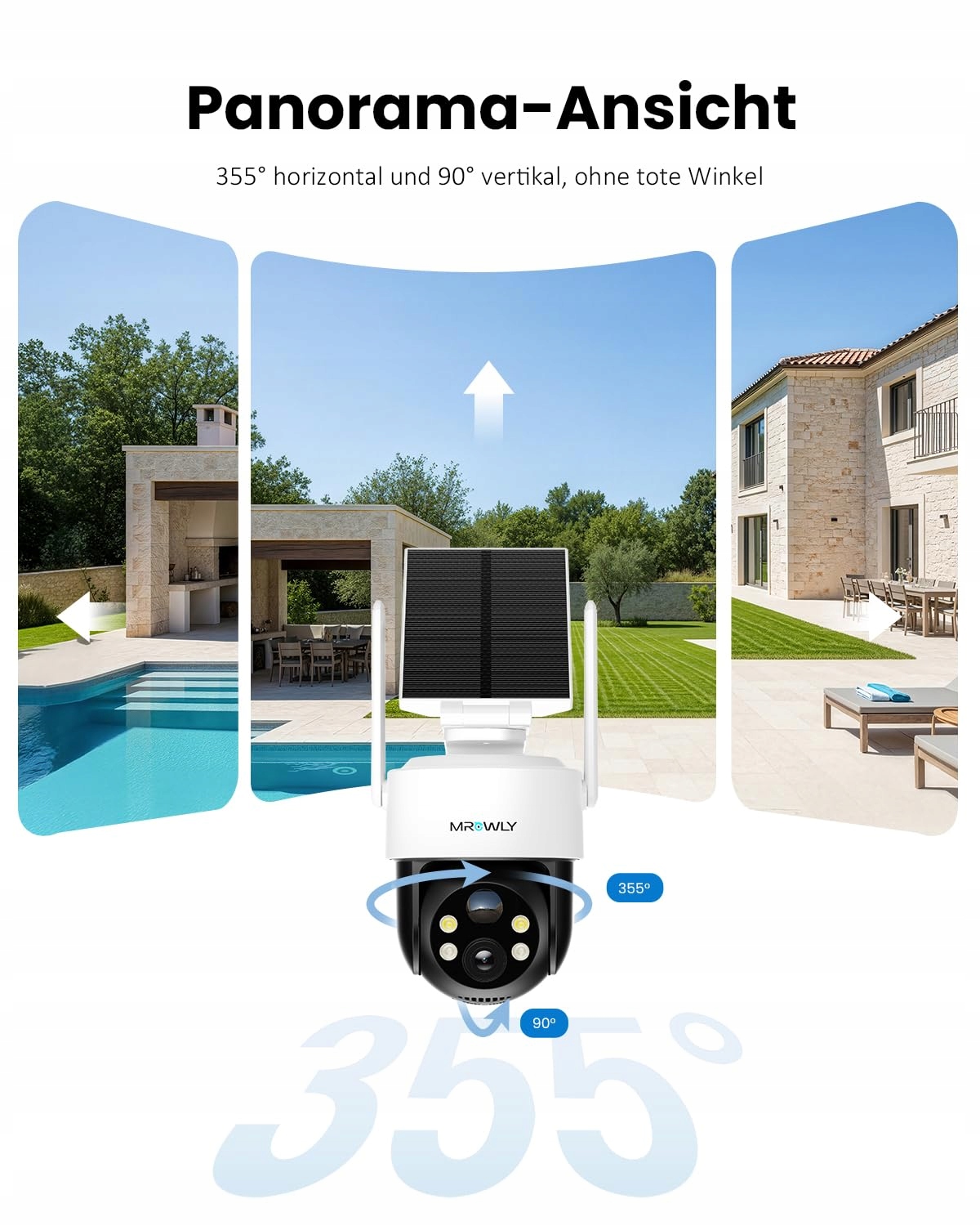 【2,4 GHz WLAN i pokrycie 360°】Zewnętrzna kamera monitoringu solarna Mrowly korzysta wyłącznie z WLAN 2,4 GHz (bez 5G) i jest zasilana przez panel solarny (kabel 3 m) z wydajnym akumulatorem. Obrót poziomy 355° i pionowy 90° za pomocą aplikacji umożliwia pełny monitoring bez martwych stref.