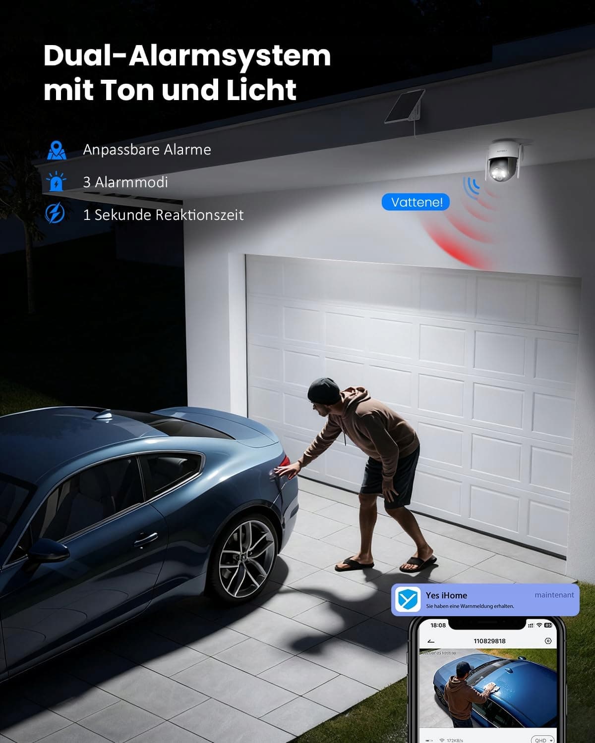 【Wykrywanie PIR i potrójny alarm】Inteligentny czujnik PIR redukuje fałszywe alarmy dzięki precyzyjnemu wykrywaniu ludzi. W przypadku podejrzenia: natychmiastowe (1 s) powiadomienie na telefon, aktywowane alarmy i ostrzeżenie głosowe jako odstraszacz.