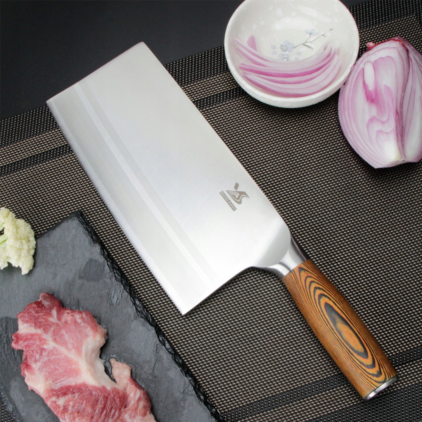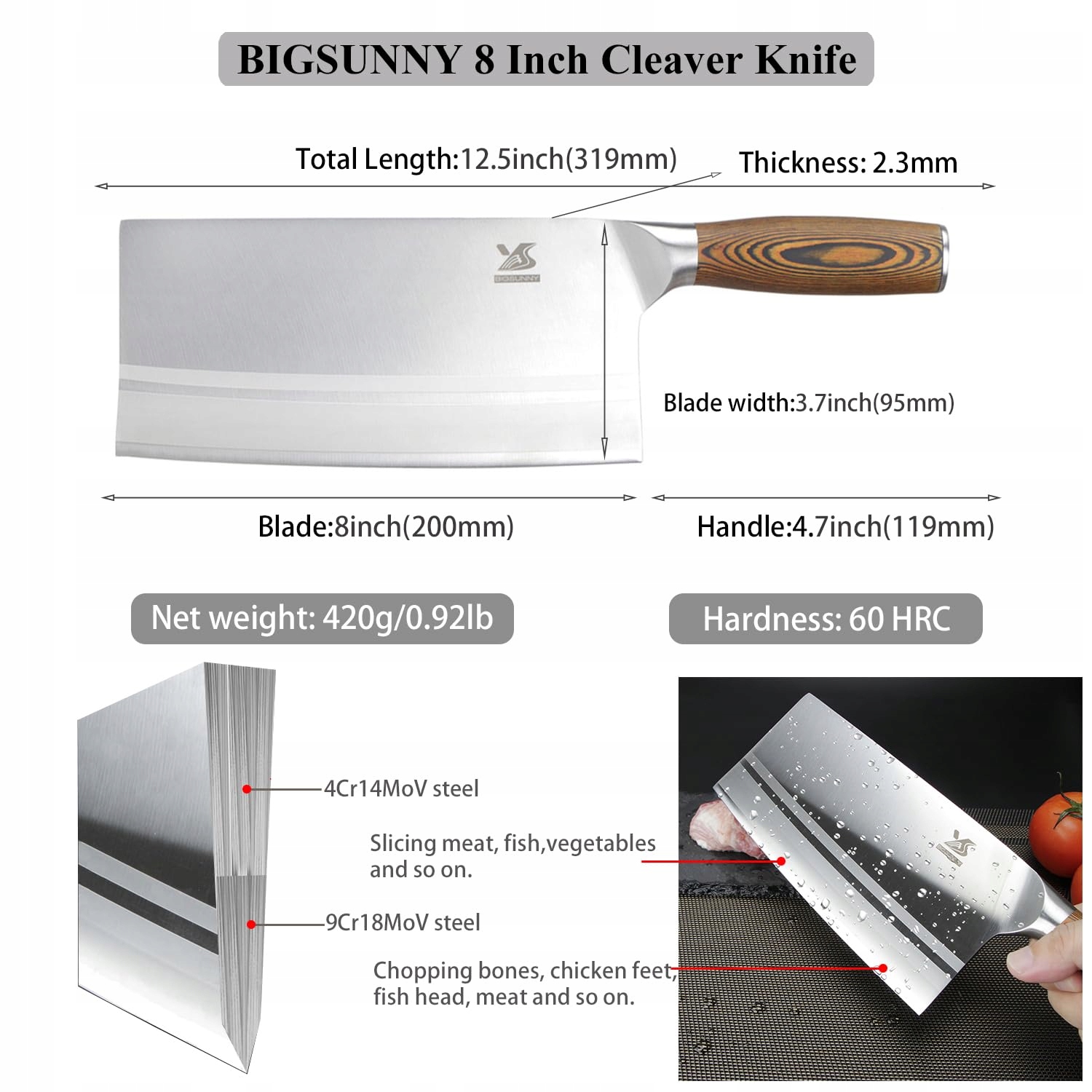 【Dobrze zaprojektowany nóż】Ostrze noża wykonane jest z wysokiej jakości stali nierdzewnej 9Cr18MoV o twardości do 60 Rockwella, co zapewnia lepszą równowagę między twardością a odpornością, dzięki czemu nóż do siekania jest odporny na zużycie i rdzewienie. Profesjonalny chiński nóż jest łatwy do naostrzenia. Nie musisz ciągle wymieniać noży.