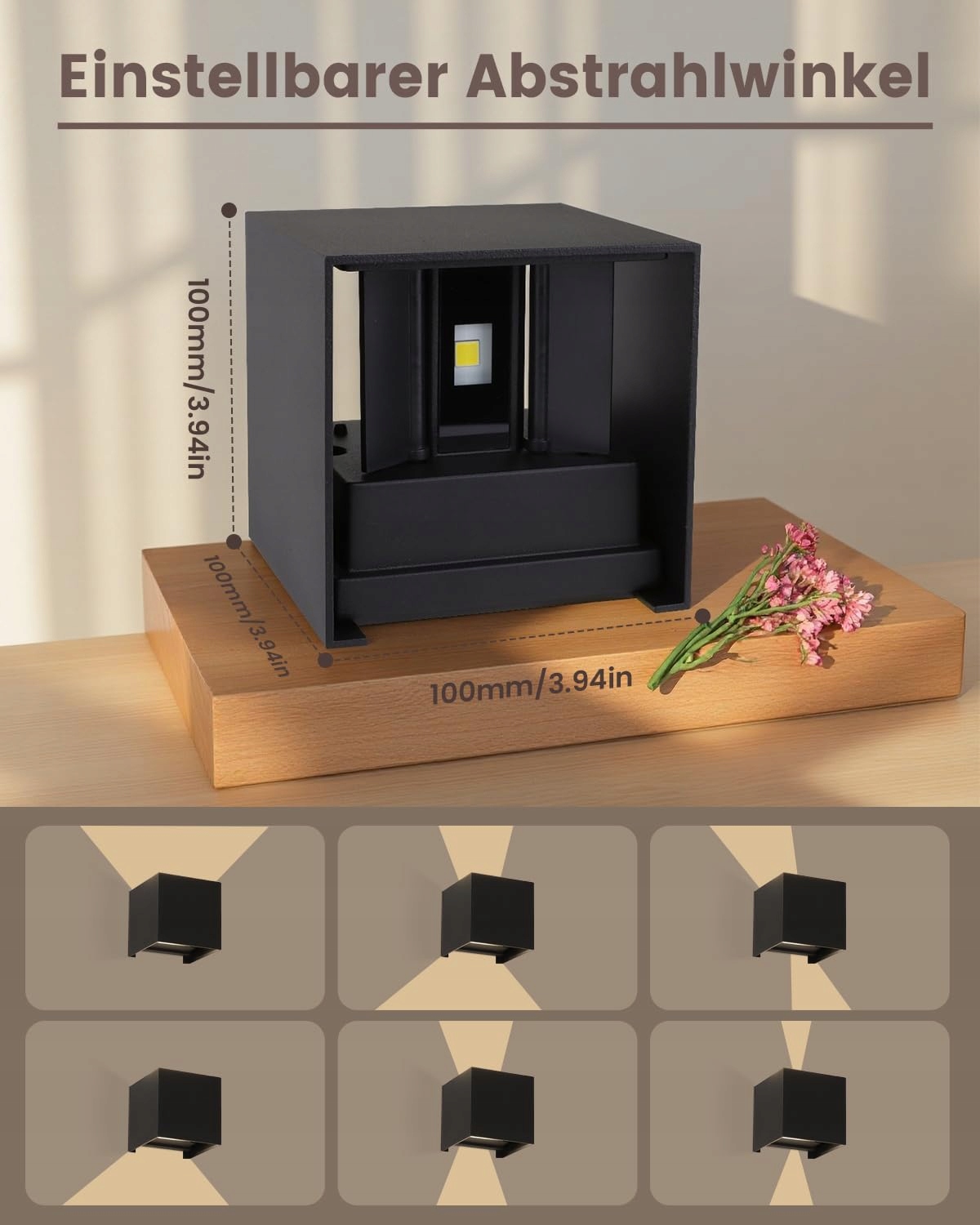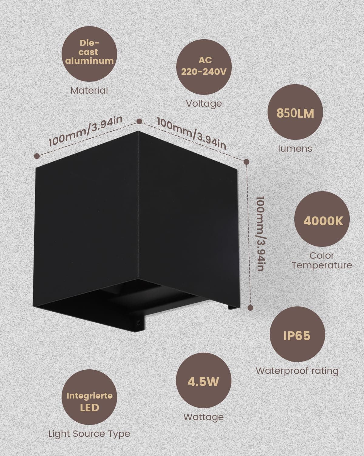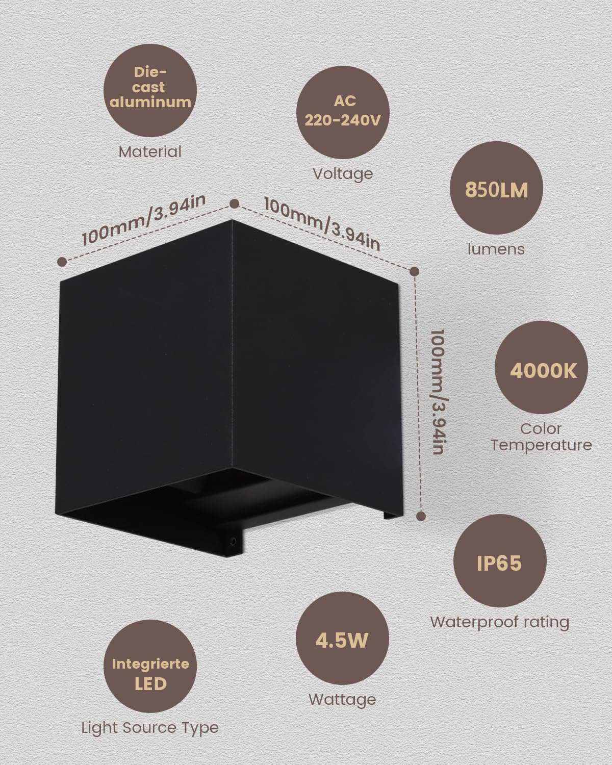 【Optymalny komfort świetlny LED do lampy ściennej do wnętrz i na zewnątrz】Ta lampa ścienna na zewnątrz z technologią LED 4,5W (850 lumenów, 4000K ciepła biel) – bez olśnienia i migotania. Idealna do ogrodów, tarasów lub wejść. Oszczędza 80% energii w porównaniu z tradycyjnymi lampami zewnętrznymi, idealna jako lampa ścienna do wnętrz i na zewnątrz