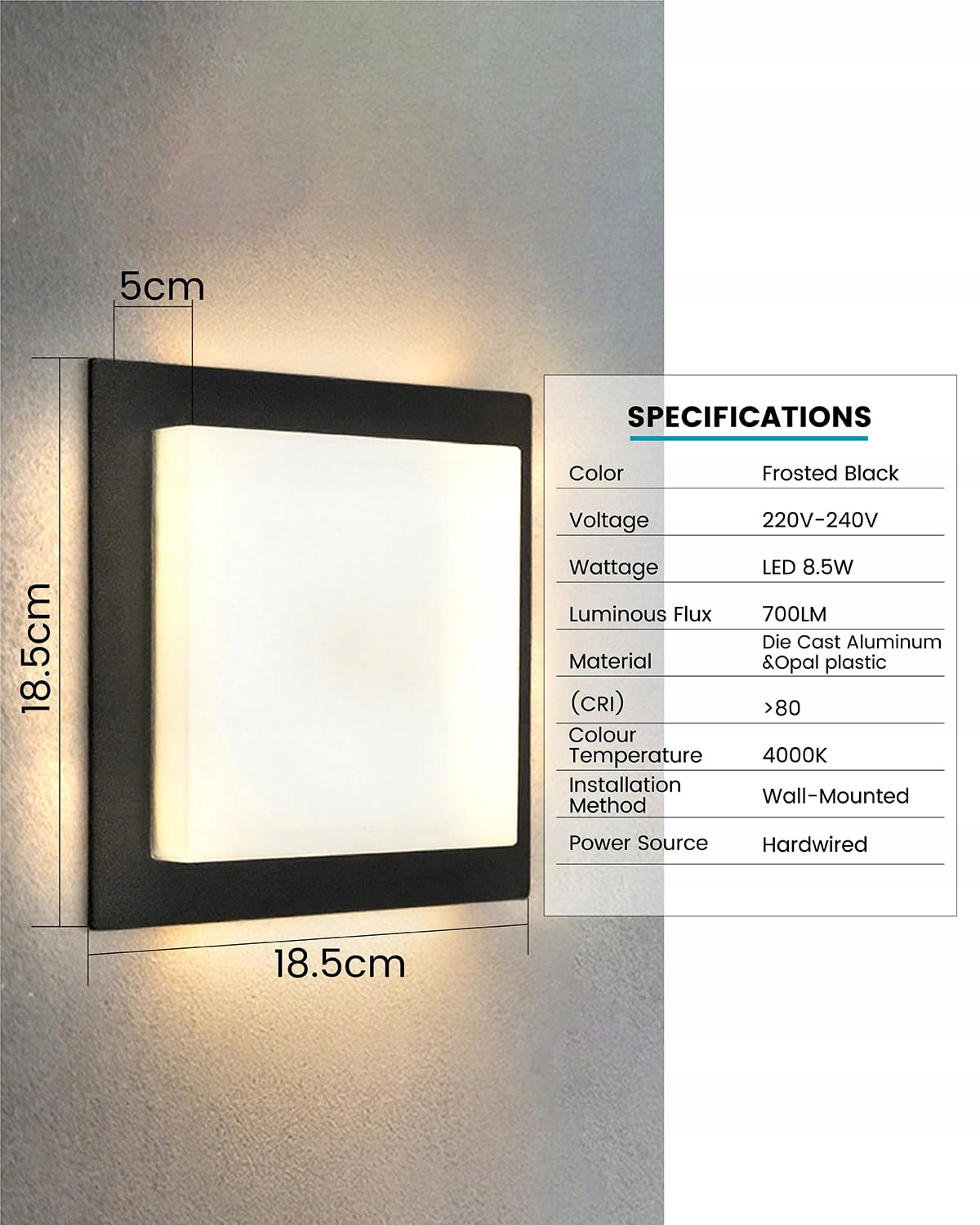 【Wysokiej jakości materiały dla trwałości】Korpus lampy wykonany z odlewanego aluminium zapewnia wytrzymałość i odporność na korozję, podczas gdy opalowy plastik (biała, matowa osłona) rozprasza delikatne, nieoślepiające światło. To połączenie sprawia, że kinkiet zewnętrzny jest nie tylko odporny na warunki atmosferyczne, ale także estetycznie atrakcyjny do stałego użytkowania na zewnątrz.