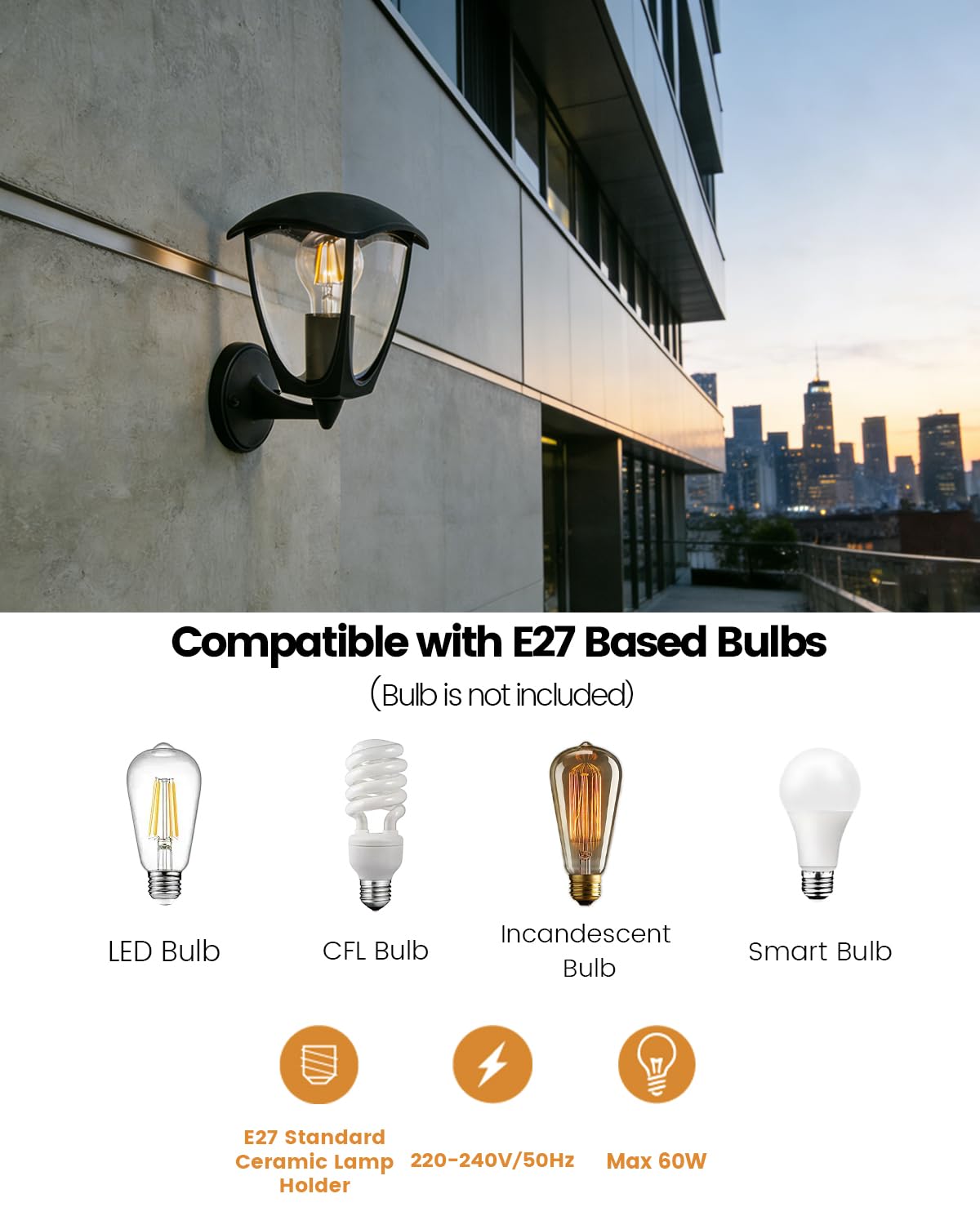 【ENERGOOSZCZĘDNA I DOPASOWYWALNA】Wyposażona w uniwersalne gniazdo E27 (max. 25W), kompatybilna z lampami LED, energooszczędnymi lub halogenowymi. Obniż swoje rachunki za prąd nawet o 90 % w porównaniu z modelami halogenowymi! Żarówka nie jest dołączona – wybierz dowolnie ciepłe/zimne barwy światła, aby spersonalizować atmosferę na zewnątrz.