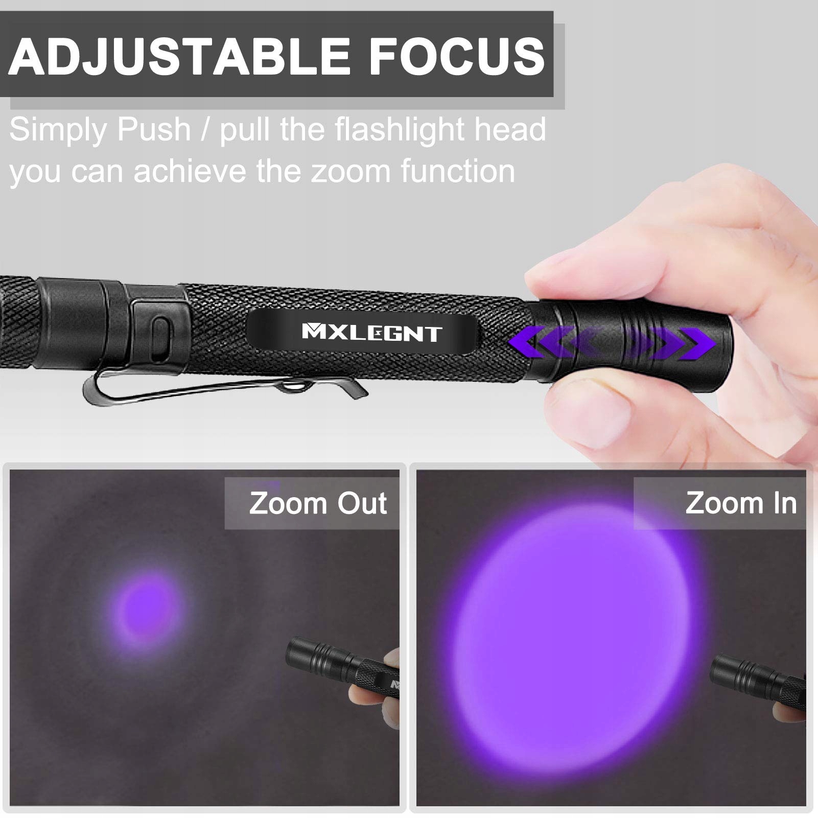 MXLEGNT UV Latarka 2 sztuki Czarny światło 395nm Ultrafioletowa lampa Zoomowalna, detektor moczu zwierząt domowych i pluskiew Zasilana bateriami AAA (Czarne światło, zestaw 2 sztuk, bez baterii)