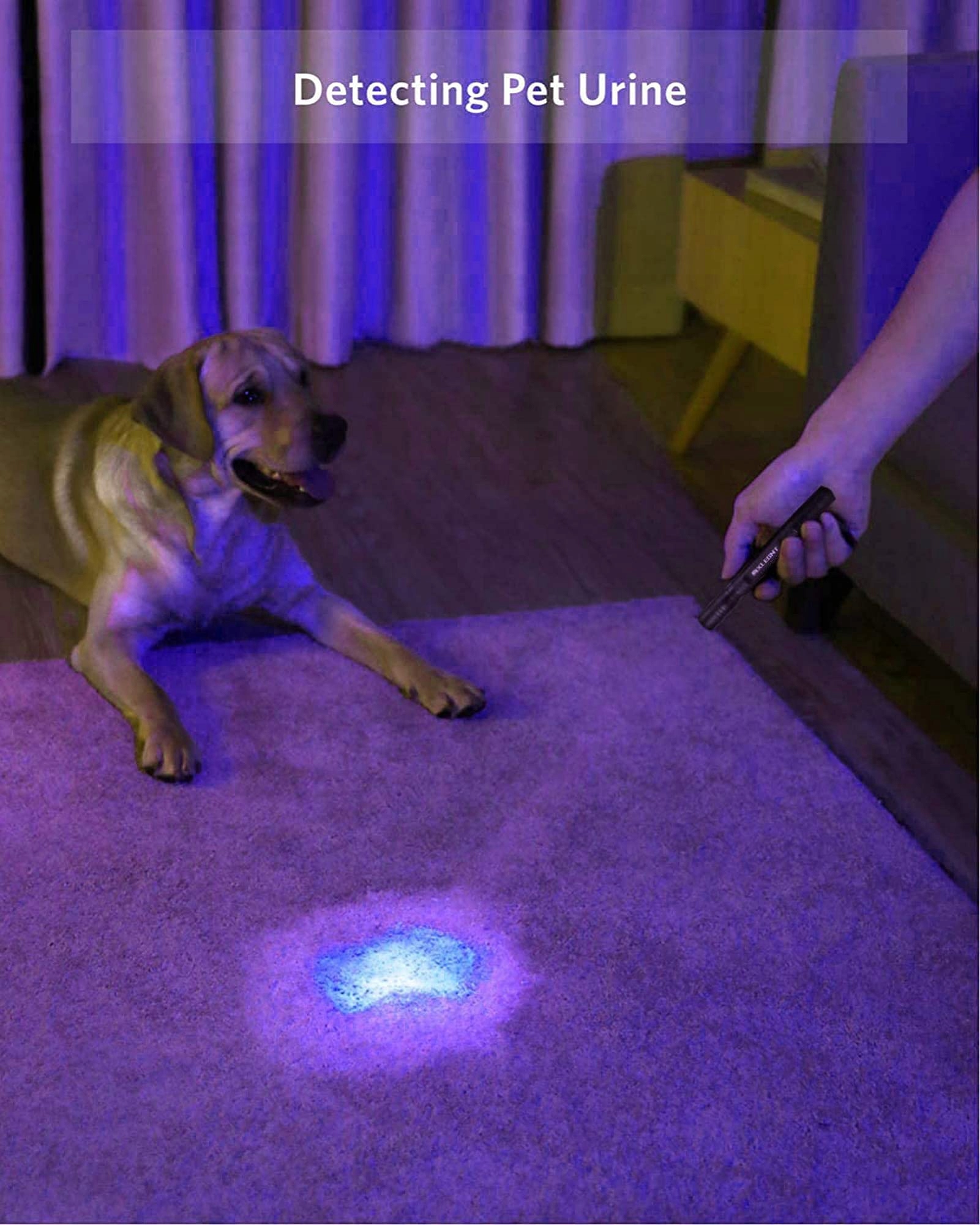 [Szerokie zastosowanie] Światło UV może pomóc znaleźć fluorescencyjne wybielacze zawarte w ubrankach dziecięcych lub kosmetykach. Łatwo wykrywa niewidoczne plamy jedzenia na podłodze lub stole. Wyraźnie pokazuje również plamy z moczu kotów/psów/myszy/zwierząt na dywanach/ubraniach. Latarka może być używana do identyfikacji fałszywych banknotów, prawa jazdy, paszportów, a także do poszukiwania skorpionów i pluskiew.