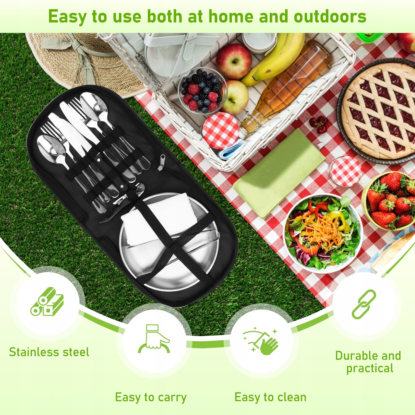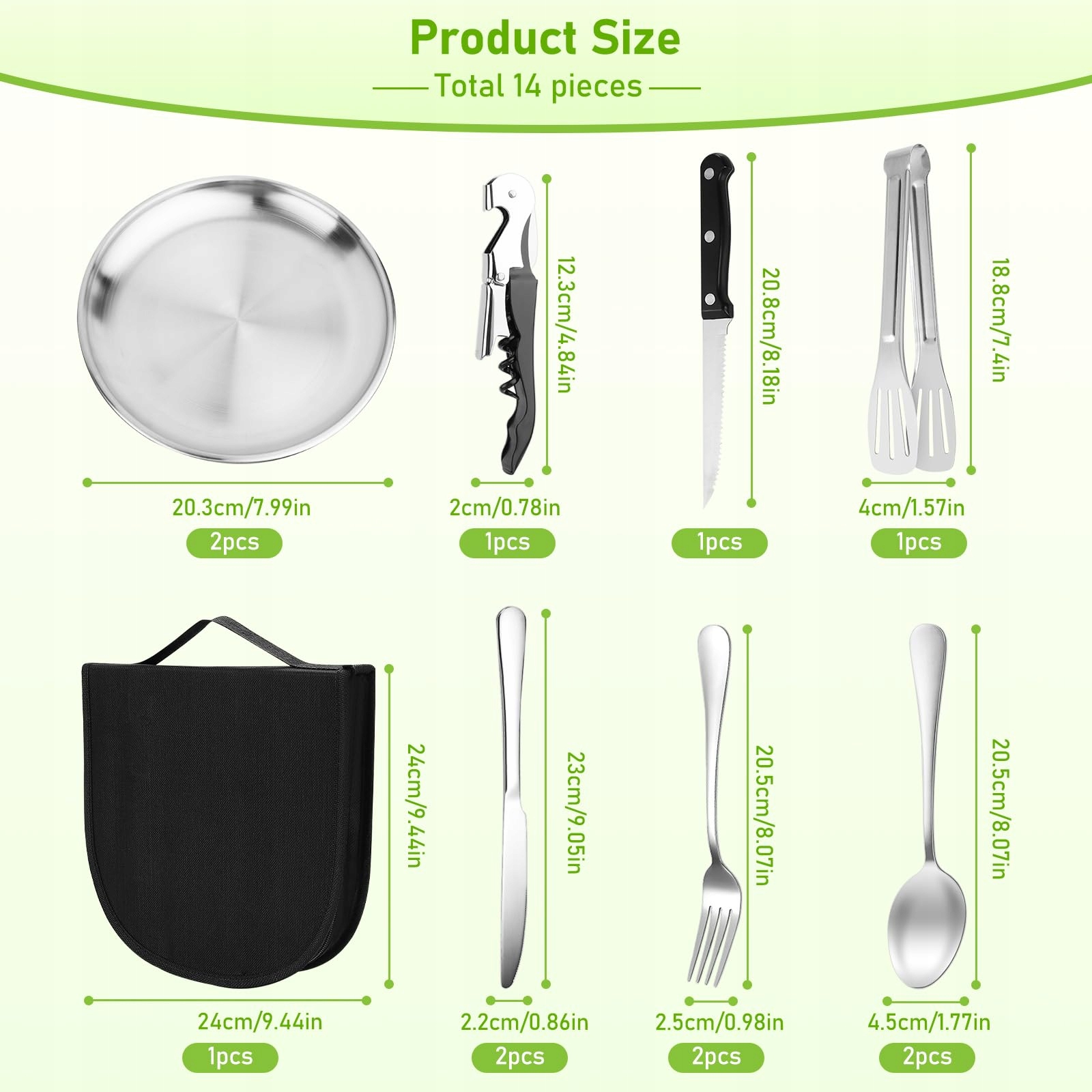 Zestaw sztućców kempingowych: zestaw sztućców składa się z 2 x widelców, 2 x łyżek, 2 x noży stołowych, 1 x noża do steków, 2 x 8-calowych stalowych talerzy, 1 x klipsa do steków, 1 x otwieracza do butelek, 1 x przenośnej torby do przechowywania, 2 x serwetek, idealny dla par lub przyjaciół podczas kempingu lub pikniku