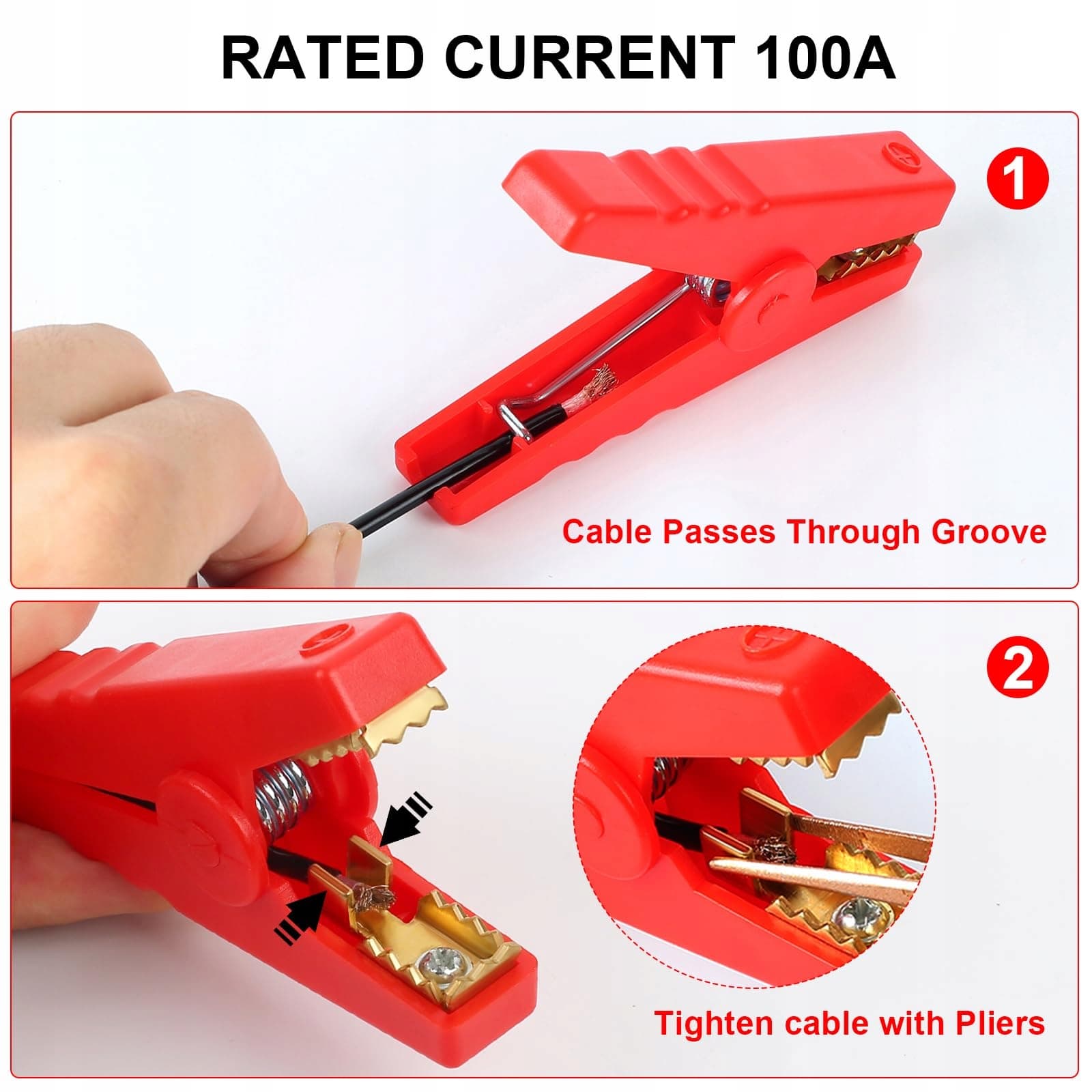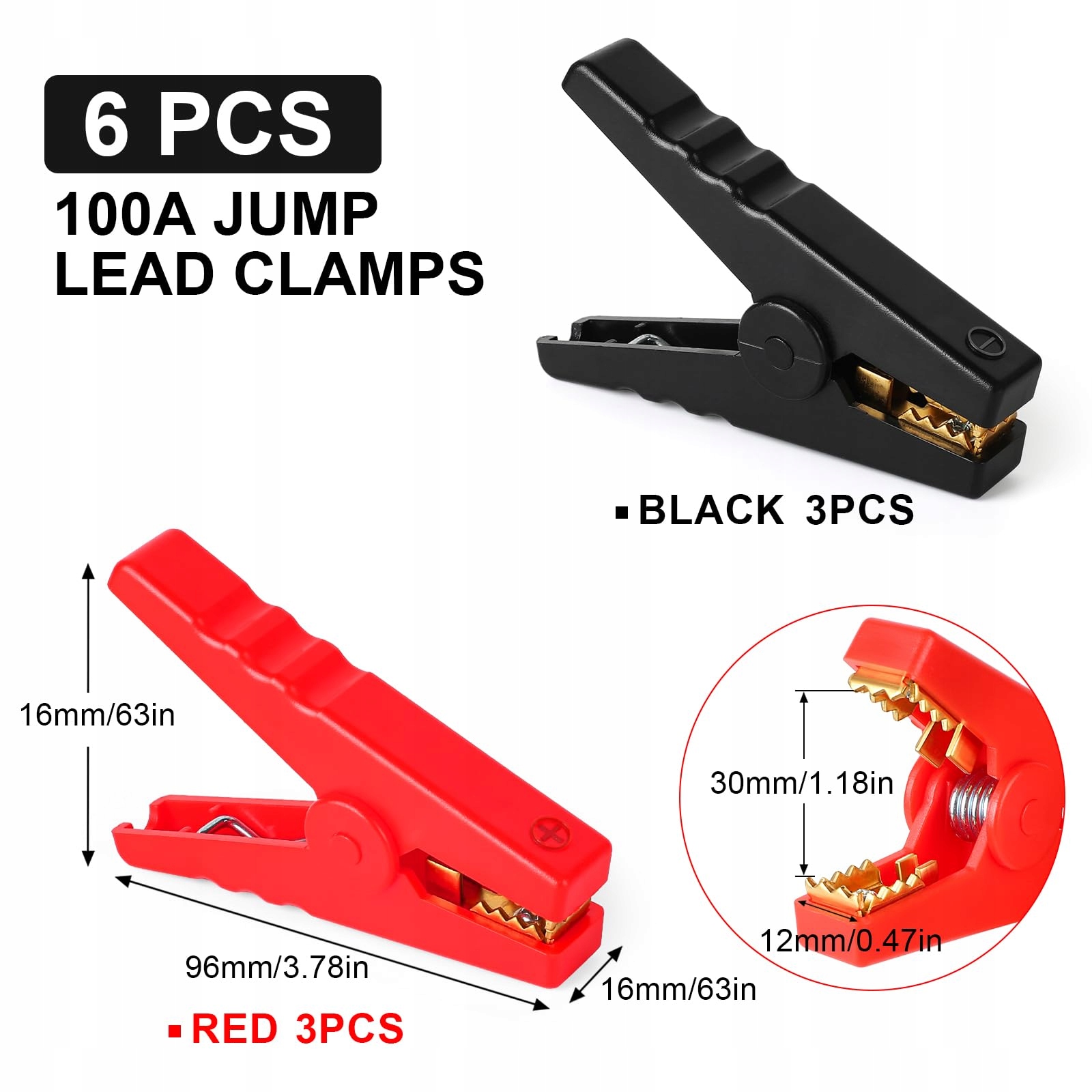 🔥【Prąd znamionowy 100A】Zaciski krokodylkowe do akumulatorów samochodowych mają ocenę 100A; całkowita długość zacisków krokodylkowych wynosi 90mm, szerokość otwarcia szczęk to 30mm/1,18 cala (maksymalnie). Zaciski do akumulatora używają kombinacji czarnego i czerwonego koloru, co ułatwia rozróżnienie między biegunem dodatnim a ujemnym i zmniejsza ryzyko błędnego użycia.