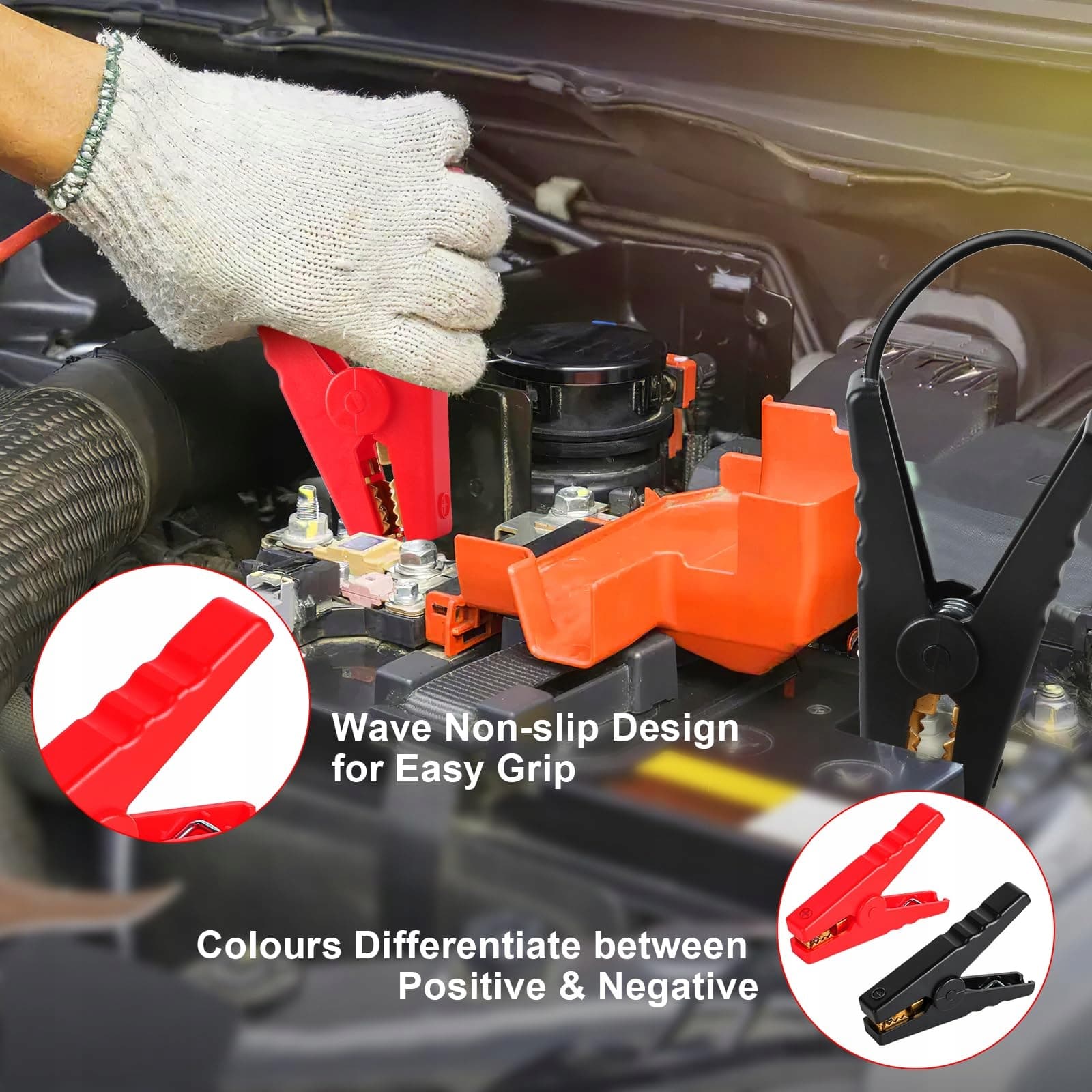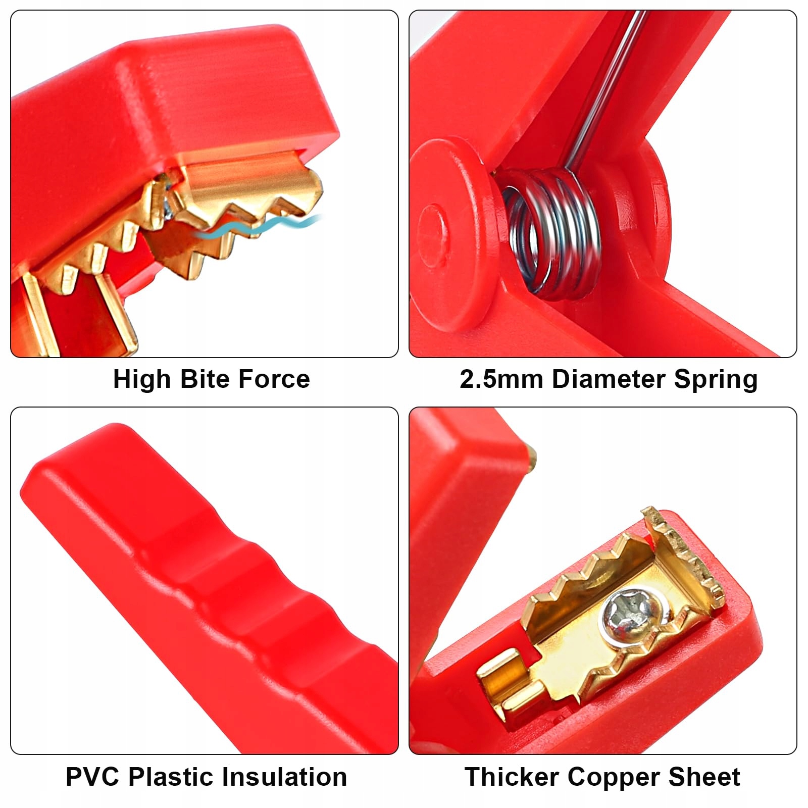 🔥【Silna siła zacisku】Szczęki zacisków do kabli rozruchowych Heavy Duty Pure mają wzór krokodyla, ząbkowane, co znacznie zwiększa siłę zacisku, rozmiar otwarcia jest duży, wewnętrzna sprężyna o średnicy 2,5 mm, wysoka elastyczność, po zaciskaniu nie łatwo wypadają.