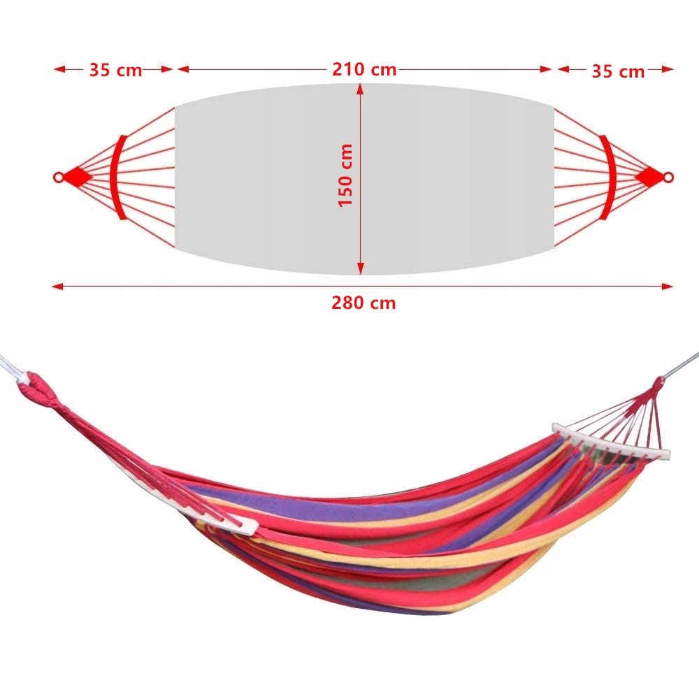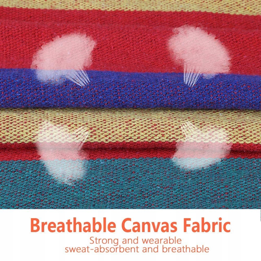 Hamak dla wielu osób - Materiał: 70% bawełna + 30% poliester z wytrzymałą krawędzią tkaniny (gęstość tkaniny 320 g/m²). Mieszanka bawełny i poliestru dobrze wchłania wilgoć. Dzięki oddychającemu materiałowi nie będziesz się pocić.