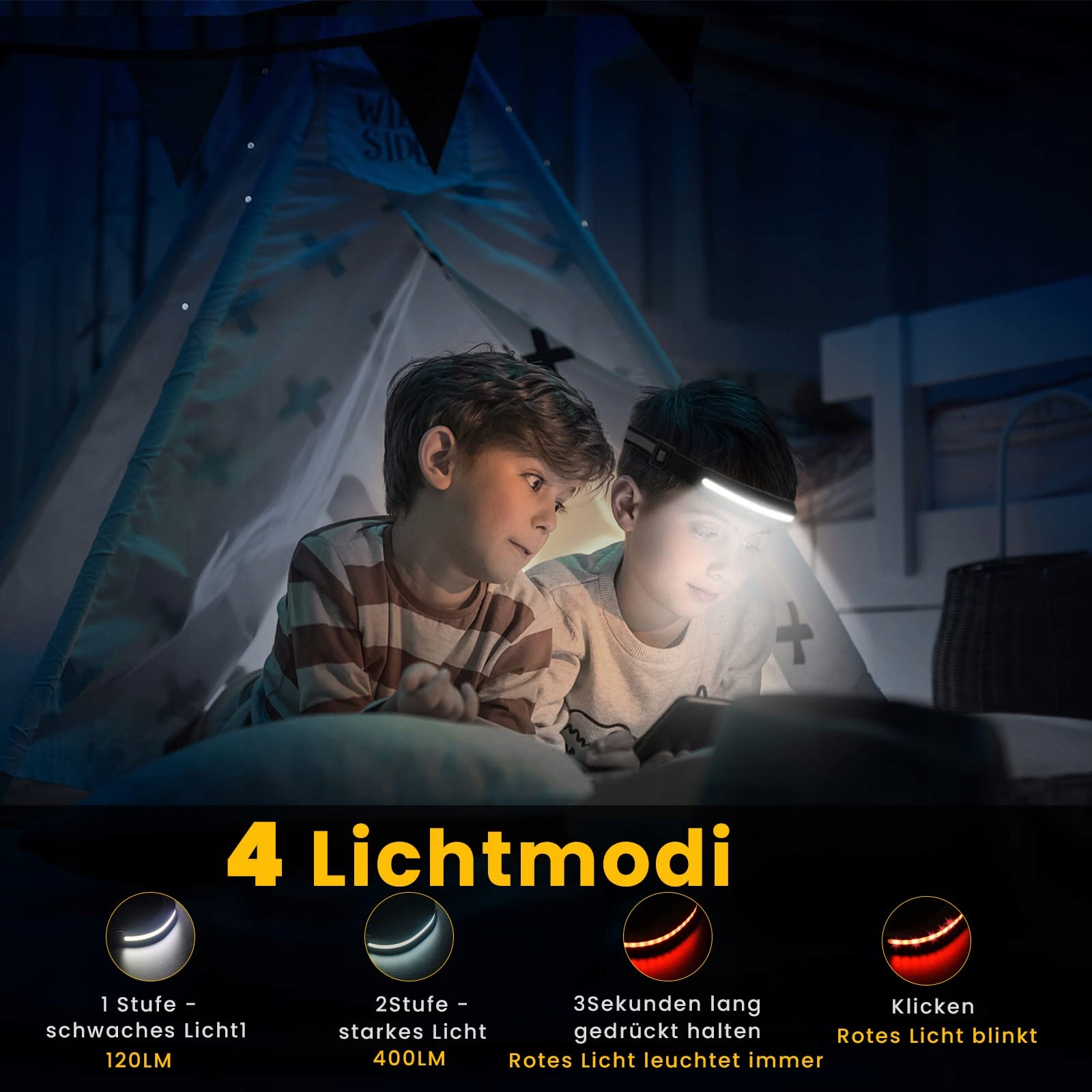 ✦[Superjasna i 4 tryby świecenia]——Lampa COB wykorzystuje wiodące w branży chipy LED i świeci do 328ft/100 metrów. 230° ultra szeroki kąt widzenia łatwo oświetla ciemne otoczenie. LED czołówka ma 4 tryby świecenia. Tryb wysoki COB, tryb niski COB, tryb wysoki LED, tryb niski LED oraz tryb stroboskopowy, a długie naciśnięcie przycisku aktywuje czerwone światło i czerwony błysk SOS.