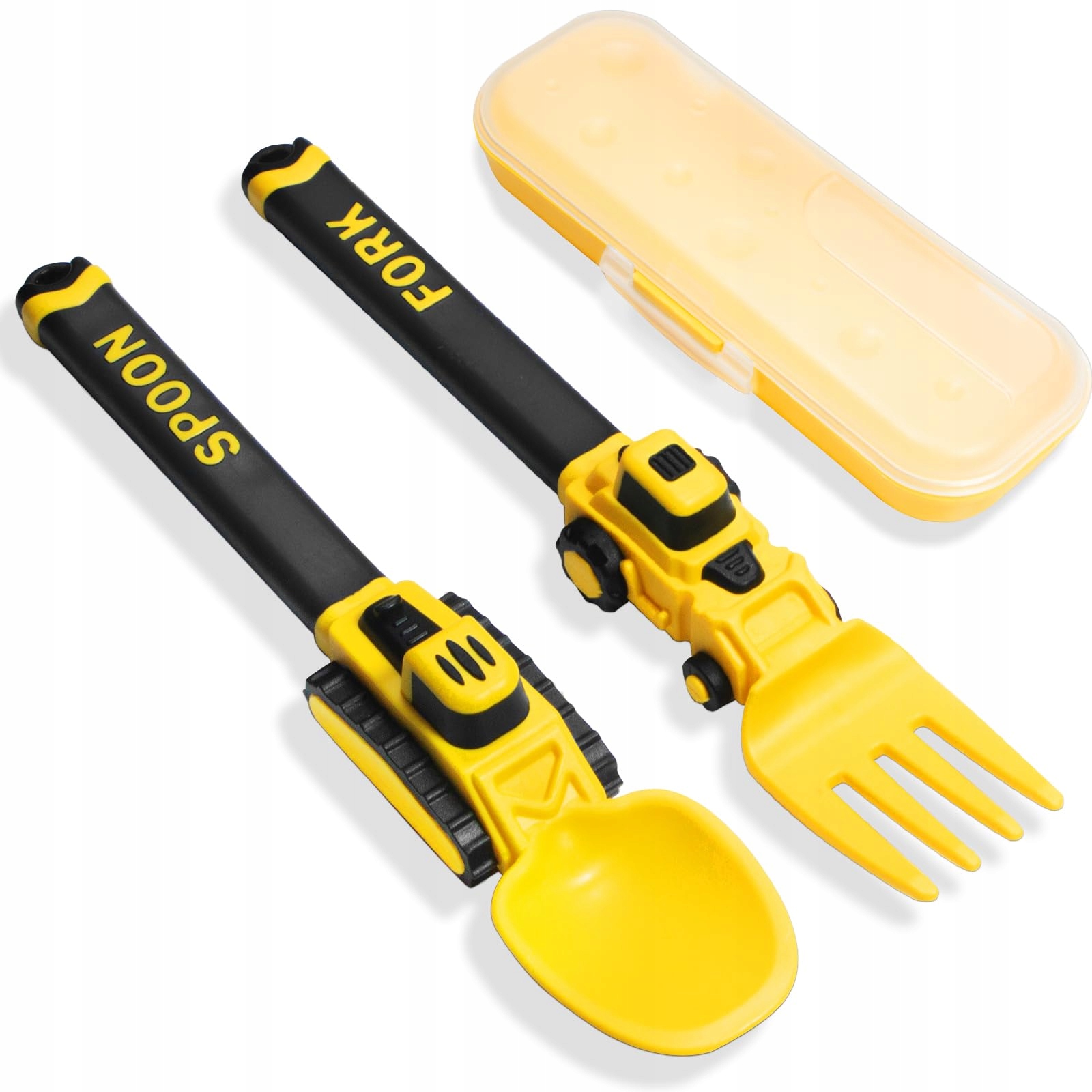 Zestaw sztućców dla dzieci Construction – sztućce dla niemowląt – odpowiednie dla dziecięcego widelca i łyżki – sztućce z koparką dla dzieci, przenośny zestaw sztućców dla małych dzieci w wieku 1, 2, 3, 4, 5 lat – żółty