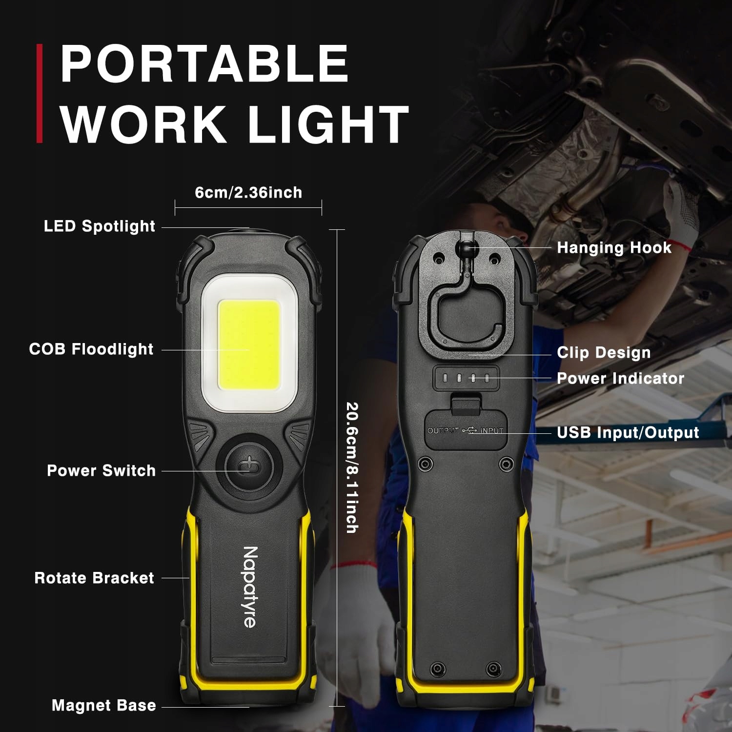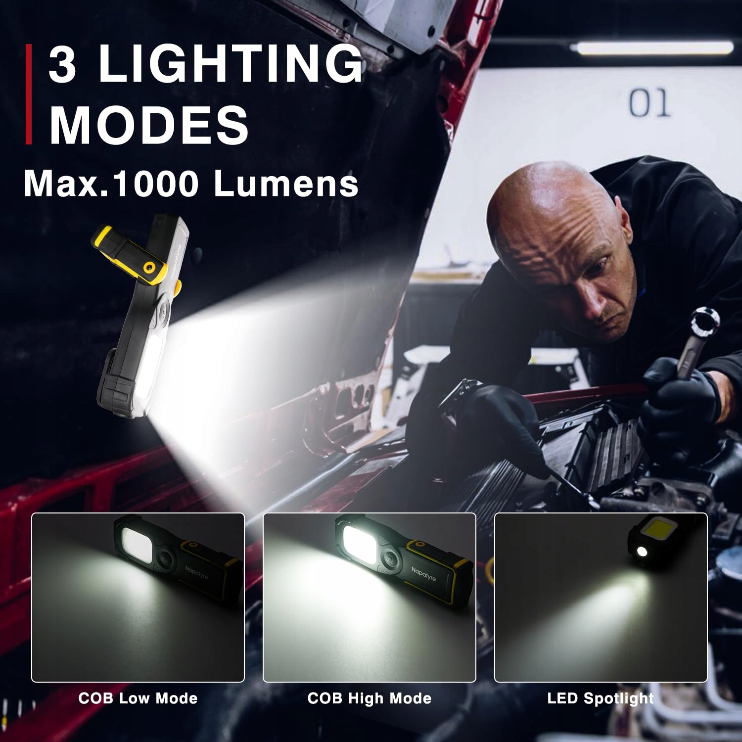 Lampa robocza LED Napatyre, 1000LM latarka LED ładowana z magnetyczną podstawą i powerbankiem, 3 tryby świetlne, 180° obracana lampa inspekcyjna do naprawy samochodów, warsztatu, garażu, awarii