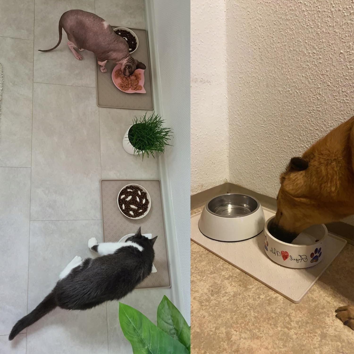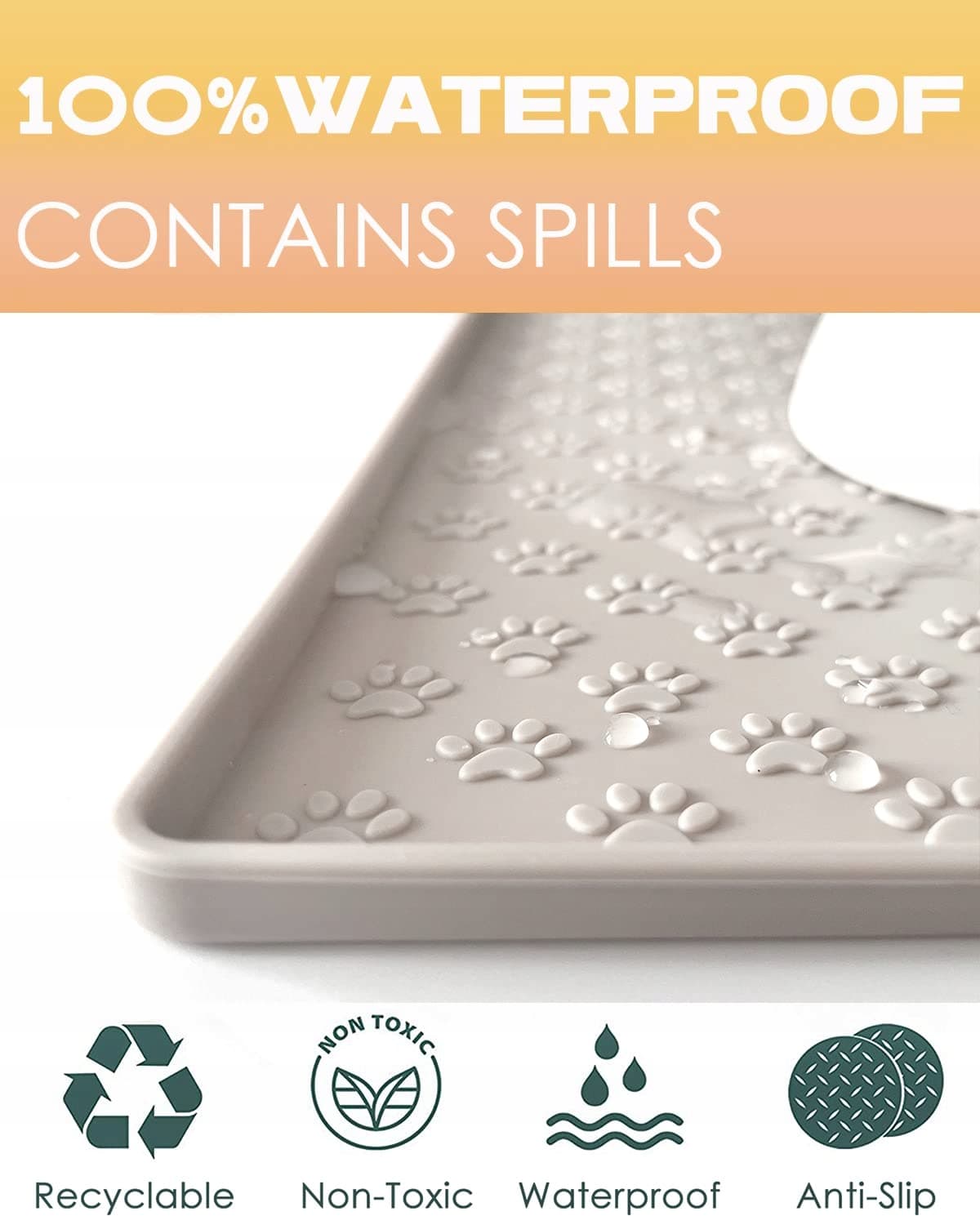 🐶🐱PERFEKCYJNY ROZMIAR & WIELOFUNKCYJNA - Rozmiar maty na jedzenie dla zwierząt wynosi 60 x 40 cm (24" x 16") i zapewnia twoim zwierzętom dużo miejsca do jedzenia. Idealna do umieszczenia pod fontanną dla zwierząt / workami z jedzeniem dla zwierząt / nad podwyższonym korytem / w kuchni lub łazience / na buty / na rośliny.
