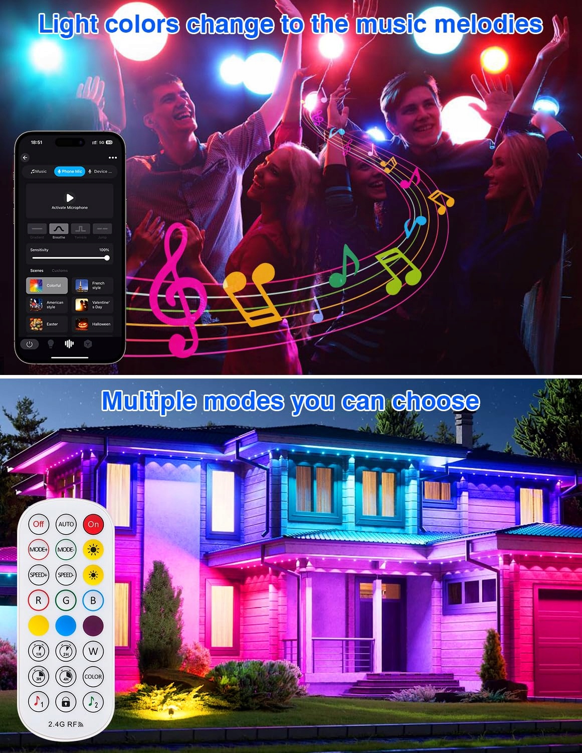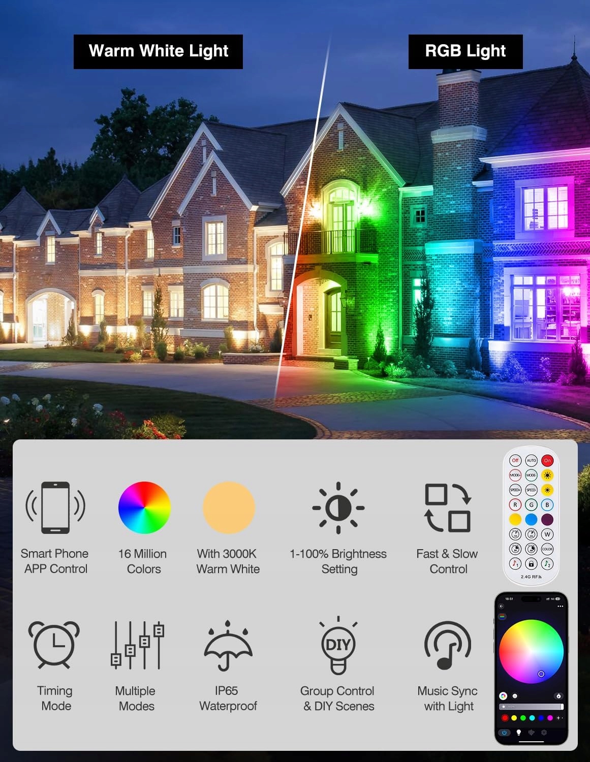 【Inteligentne oświetlenie ogrodowe】To inteligentne oświetlenie ogrodowe RGB oferuje ciepłe białe światło oraz 160 000 kolorów RGB, z regulowanymi trybami światła, jasnością i prędkością. Dostępne są również tryby takie jak synchronizacja z muzyką, sterowanie pojedyncze lub grupowe, tryb pamięci, tryb timera itp., które zapewniają bogate doświadczenia.
