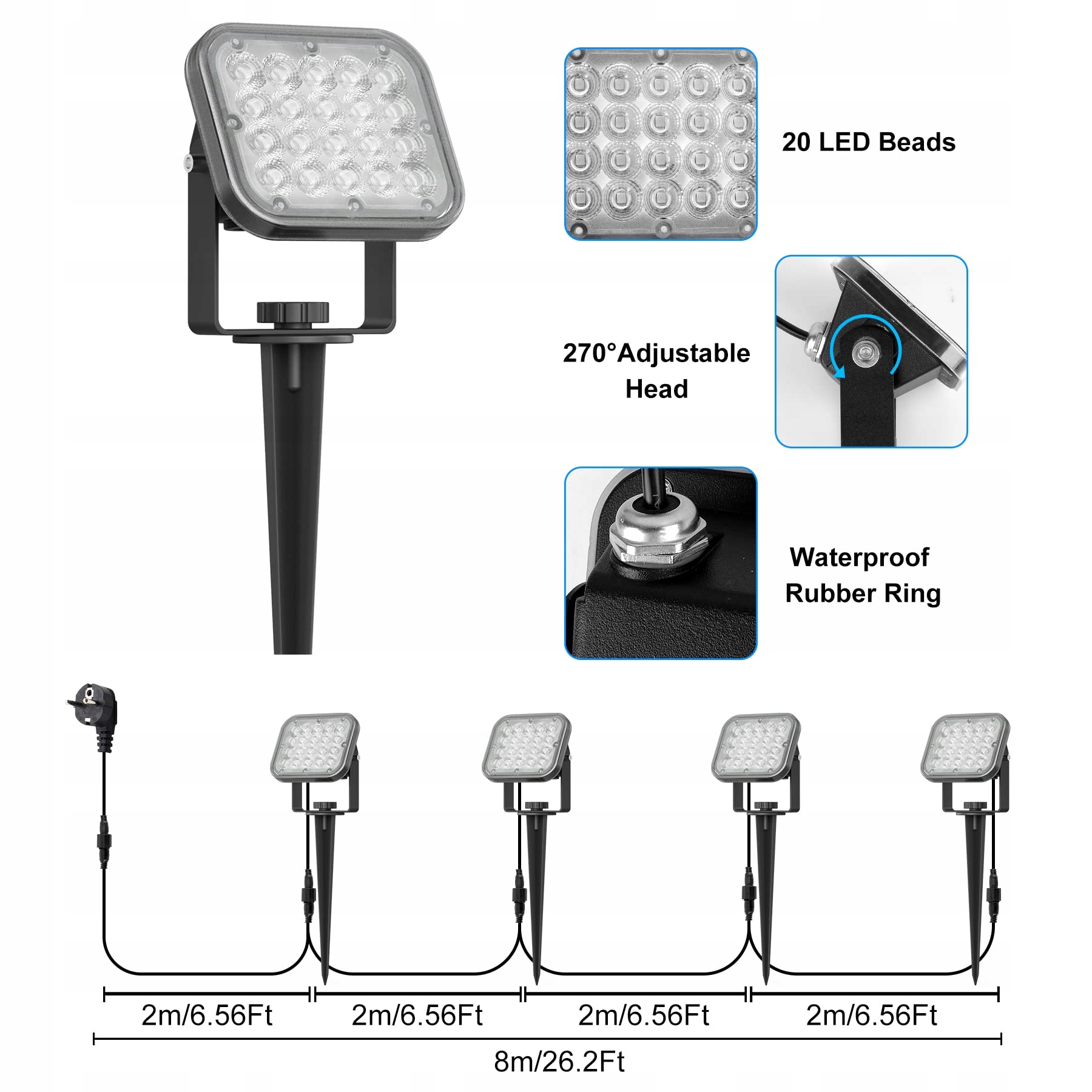 [Obracalne oświetlenie ścieżek]Zewnętrzne reflektory niskonapięciowe 12 V są wyposażone w 2 m kabla w każdej lampie, łącznie 8 m. Kąt świecenia 90° i regulowane reflektory 270° oświetlają Twój ogród, trawnik, ścieżkę, basen, donicę, garaż, chodnik i dekoracje zewnętrzne.