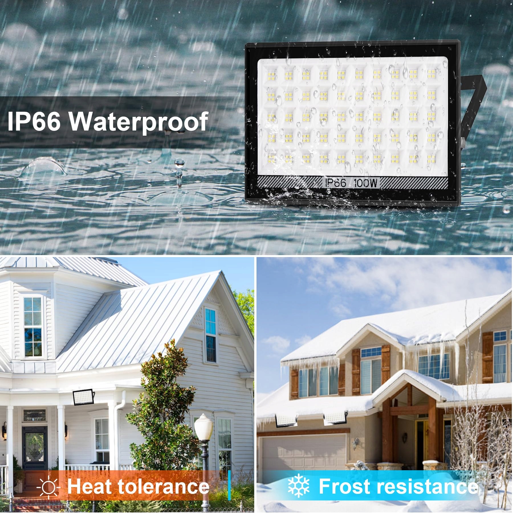 【Wodoodporny reflektor IP66】 Dzięki wodoodporności IP66, odporności na rdzę oraz powierzchniowej obróbce wysokiej jakości elektrostatycznej adsorpcji, zapewnia prawidłowe działanie światła podczas deszczu, śniegu, upału lub zimna oraz stabilne i jasne oświetlenie do ogrodów, podwórek, willi, parków, garaży, basenów, dachów, budynków, ulic, dróg itp.