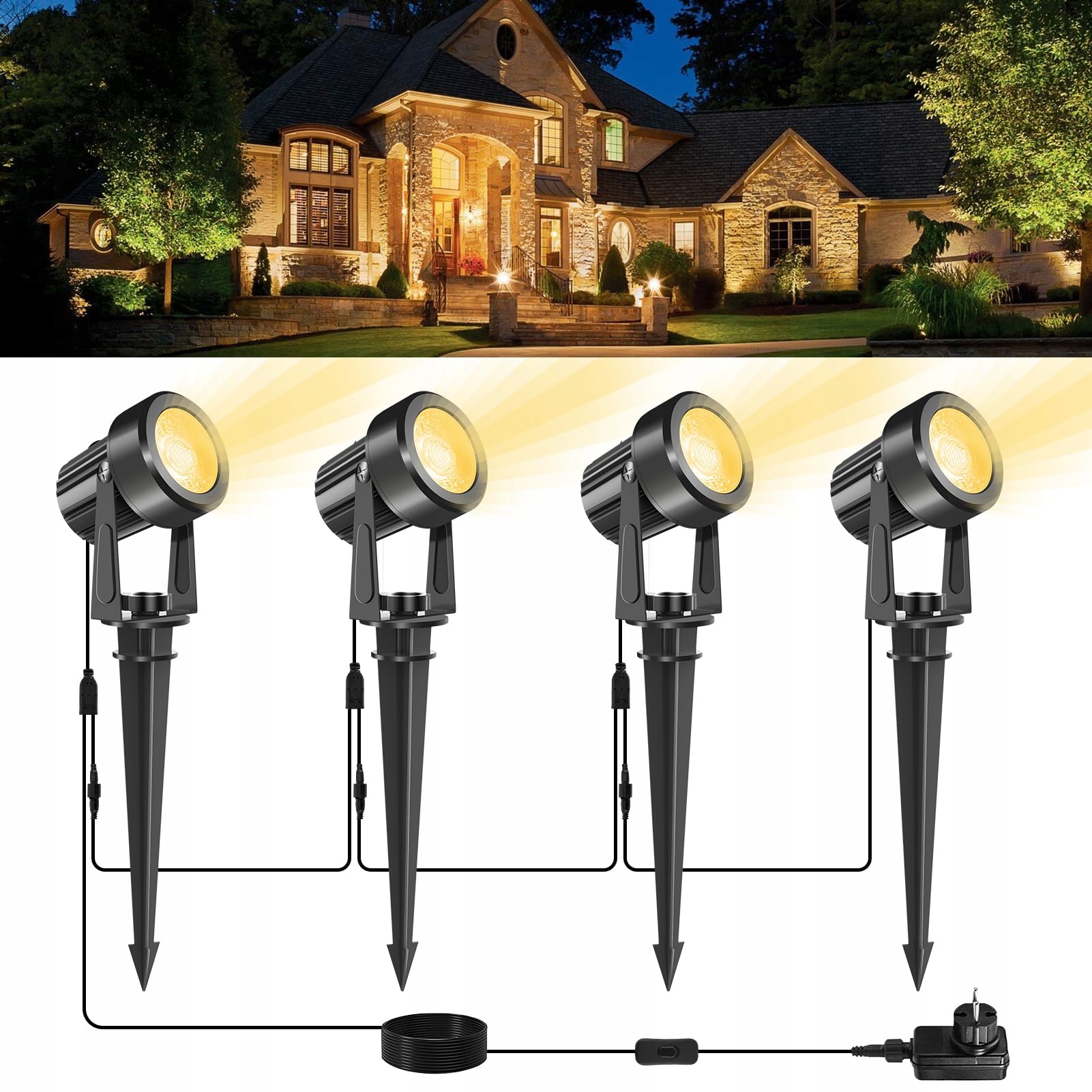 [ Łatwy montaż ] 4 wysokowydajne reflektory COB (łącznie 2000 lumenów), transformator, długi kabel (łącznie 9 m) i kołki – wszystko w zestawie! Idealne jako elastyczne oświetlenie ścieżek na balkonie, tarasie lub jako oświetlenie akcentujące rabaty. Wystarczy wbić kołki w ziemię, a Twoje oświetlenie ogrodowe zabłyśnie pełnym blaskiem. Nie jest potrzebne dodatkowe wyposażenie!