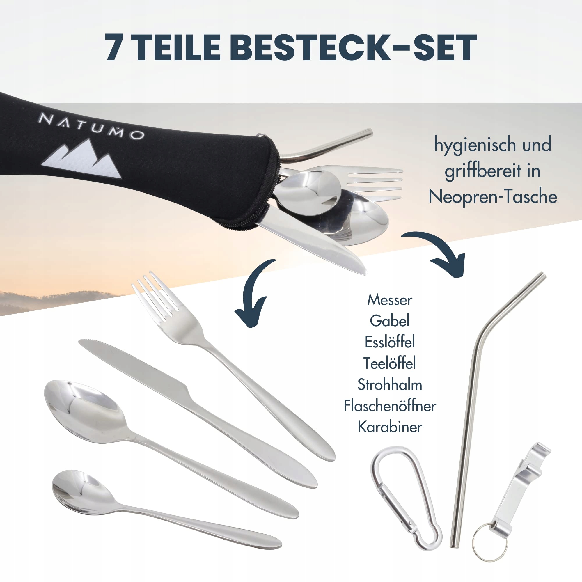 NATUMO® – Zestaw sztućców i naczyń kempingowych na zewnątrz, naczynia outdoor ze stali nierdzewnej, 10-częściowy zestaw sztućców trekkingowych + kempingowych dla 1 osoby, nierdzewny