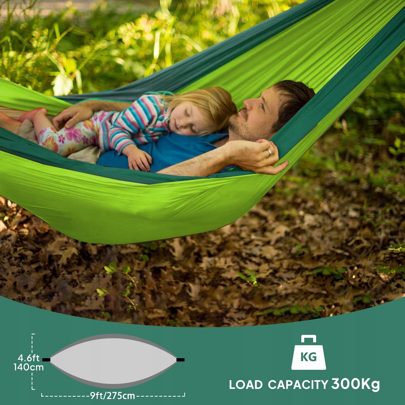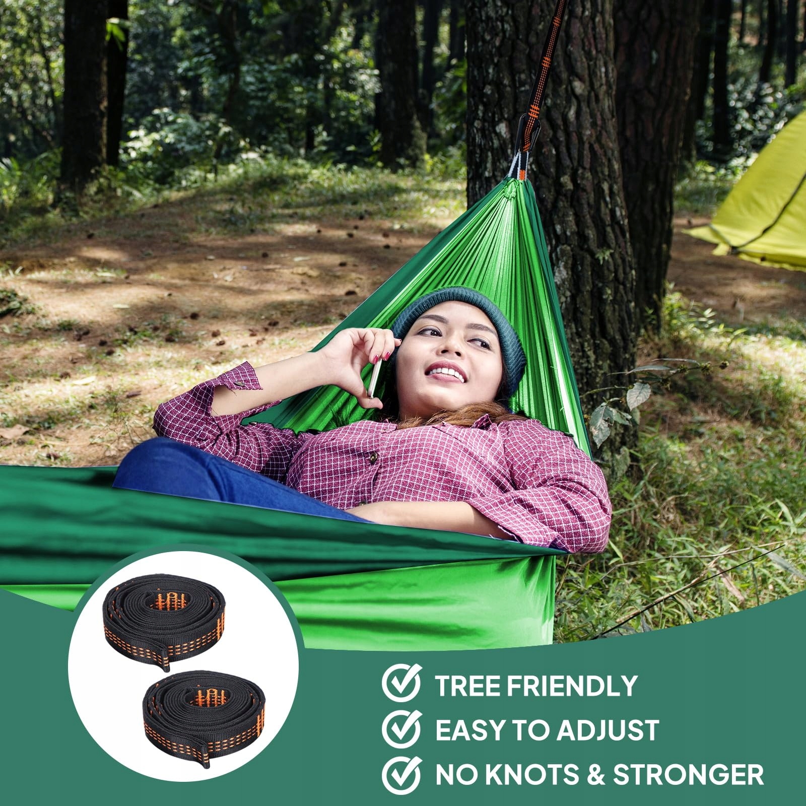 Wytrzymałość i ochrona drzew: Wykonana z nylonu spadochronowego 210T o jakości wojskowej z potrójnymi szwami i specjalnie zaprojektowanymi, ultramocnymi paskami nylonowymi. Jego wytrzymałość na zerwanie jest dwukrotnie większa i wystarczająca, aby utrzymać ponad trzech przeciętnych dorosłych! Ma również duży rozmiar (275 x 140 cm). Wyposażone szersze paski i mocne żelazne karabińczyki sprawiają, że jest bardziej stabilna i solidna, nigdy nie ślizga się na ziemię i chroni drzewo przed uszkodzeniami.