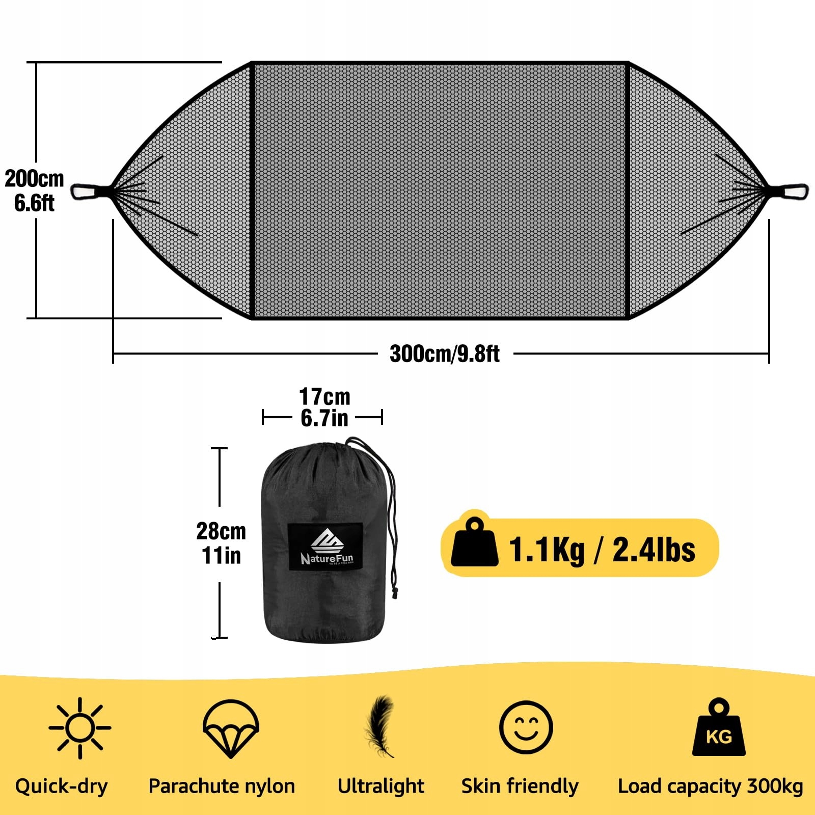 NATUREFUN Lekka Moskitiera Hamak Campingowy 300x200cm 300kg Nylon Oddychający Szybkoschnący Z Karabinkami I Paskami