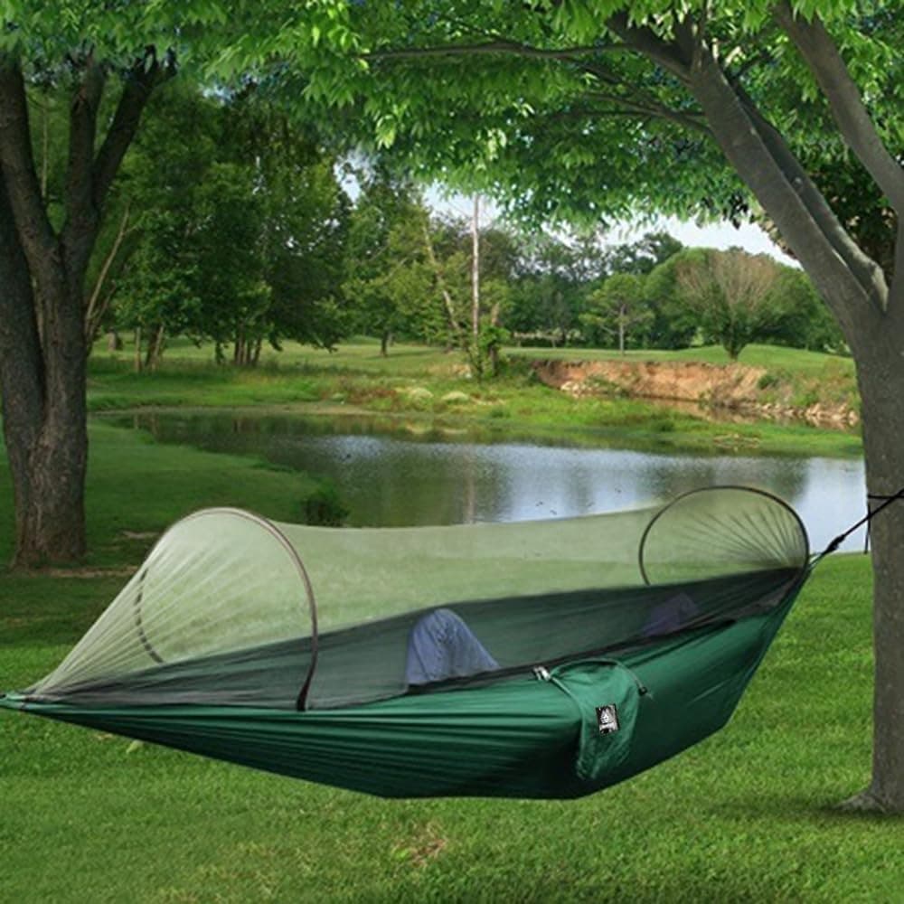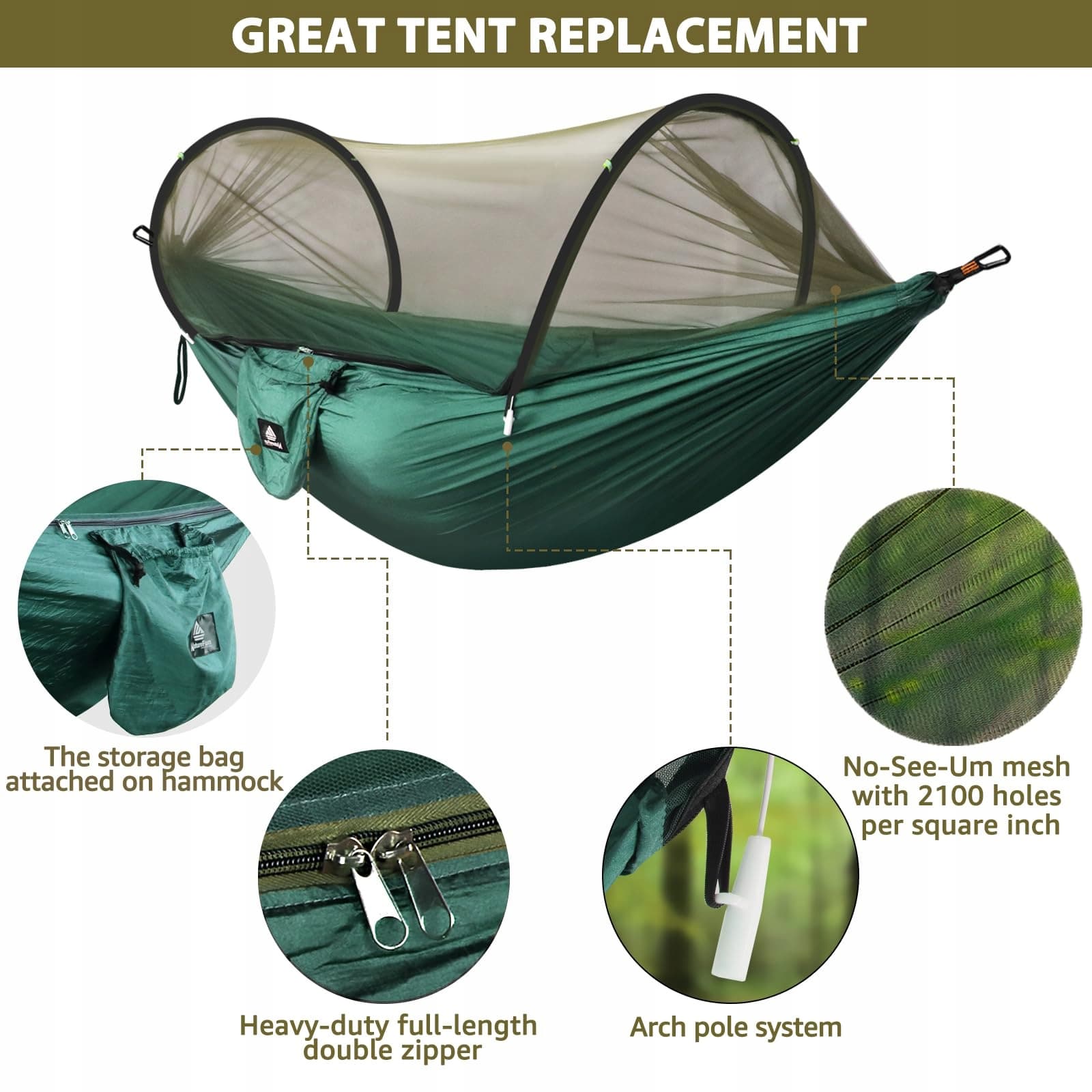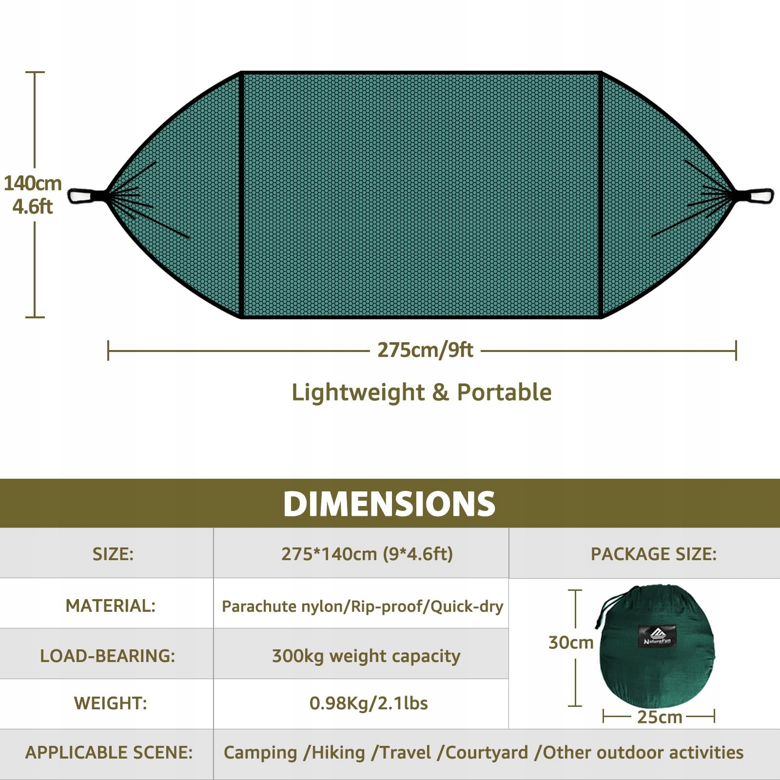 NATUREFUN Ultra Lekki Hamak Campingowy Z Moskitierą 300 kg Oddychający Szybkoschnący Nylon Spadochronowy 2 Karabinki 2 Paski Nylonowe Zielony