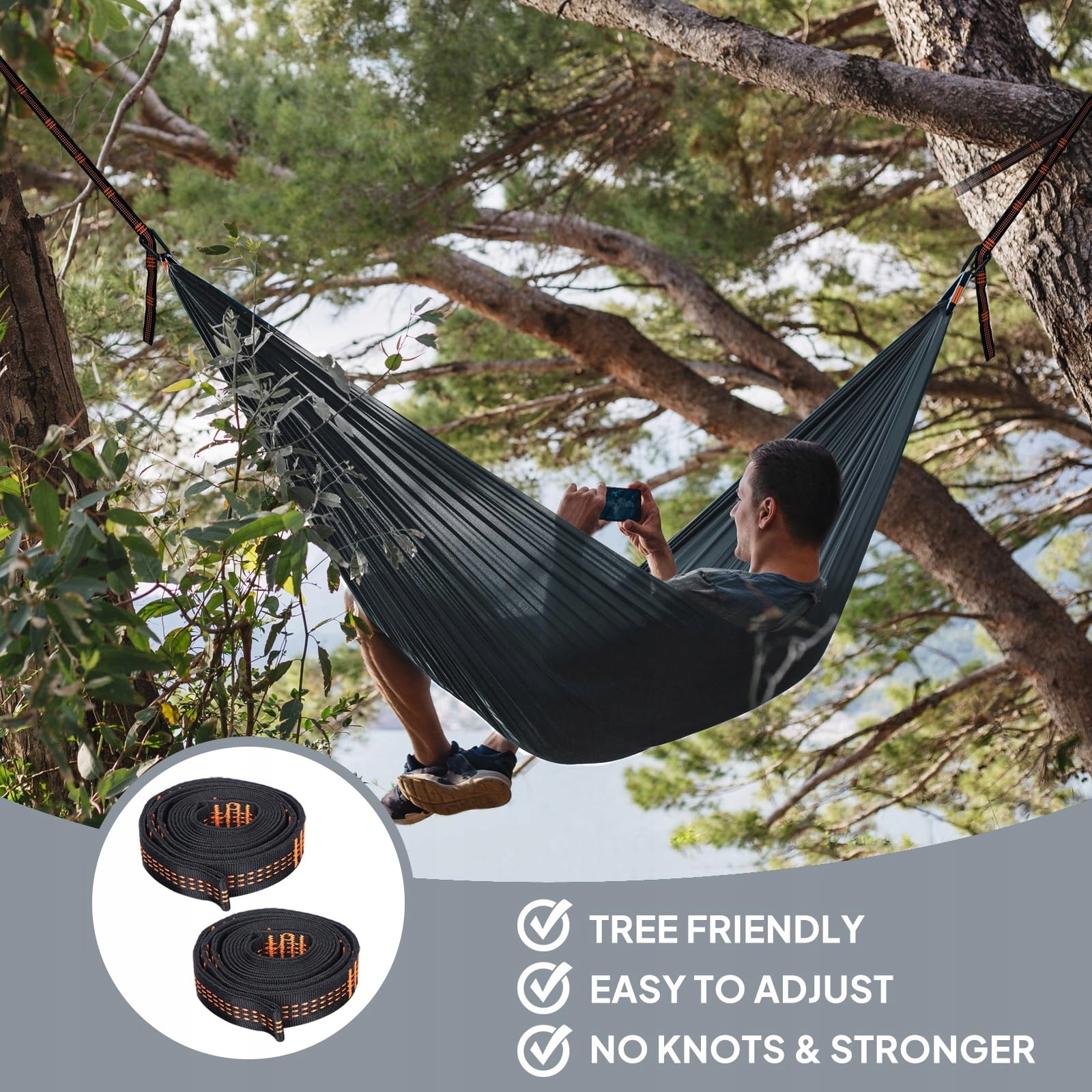 Wytrzymałość i ochrona drzew: Wykonana z wojskowego nylonu spadochronowego 210T z potrójnymi szwami i specjalnie zaprojektowanymi, ultramocnymi paskami nylonowymi. Jego wytrzymałość na zerwanie jest dwukrotnie większa i wystarczająca, aby utrzymać ponad trzech przeciętnych dorosłych! Ma również duży rozmiar (275 x 140 cm). Wyposażone szersze paski i mocne żelazne karabinki sprawiają, że jest bardziej stabilna i mocniejsza, nigdy nie ślizga się na ziemię i chroni drzewo przed uszkodzeniami.