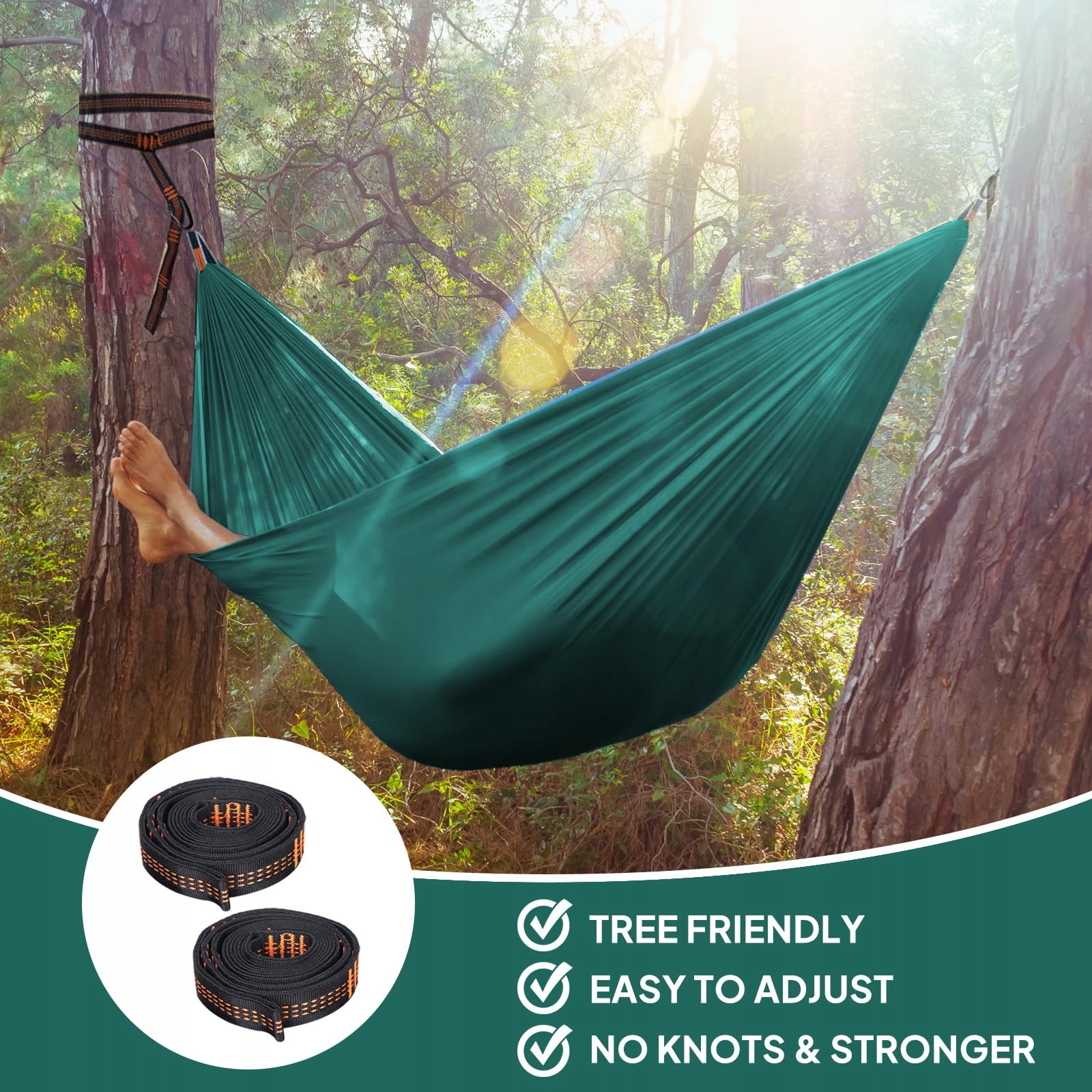 Łatwa do rozstawienia: Wystarczy włożyć hamak do małej, dołączonej torby, spakować go do plecaka i ruszyć. Dzięki zintegrowanym paskom i karabinkom montaż jest bezproblemowy. Dzięki dodatkowym dwóm paskom o długości 2 metrów można nawet zawiesić hamak między dwoma drzewami oddalonymi od siebie o sześć metrów. Paski z pętlami nigdy nie muszą być ponownie wiązane, hamak jest gotowy w kilka sekund.