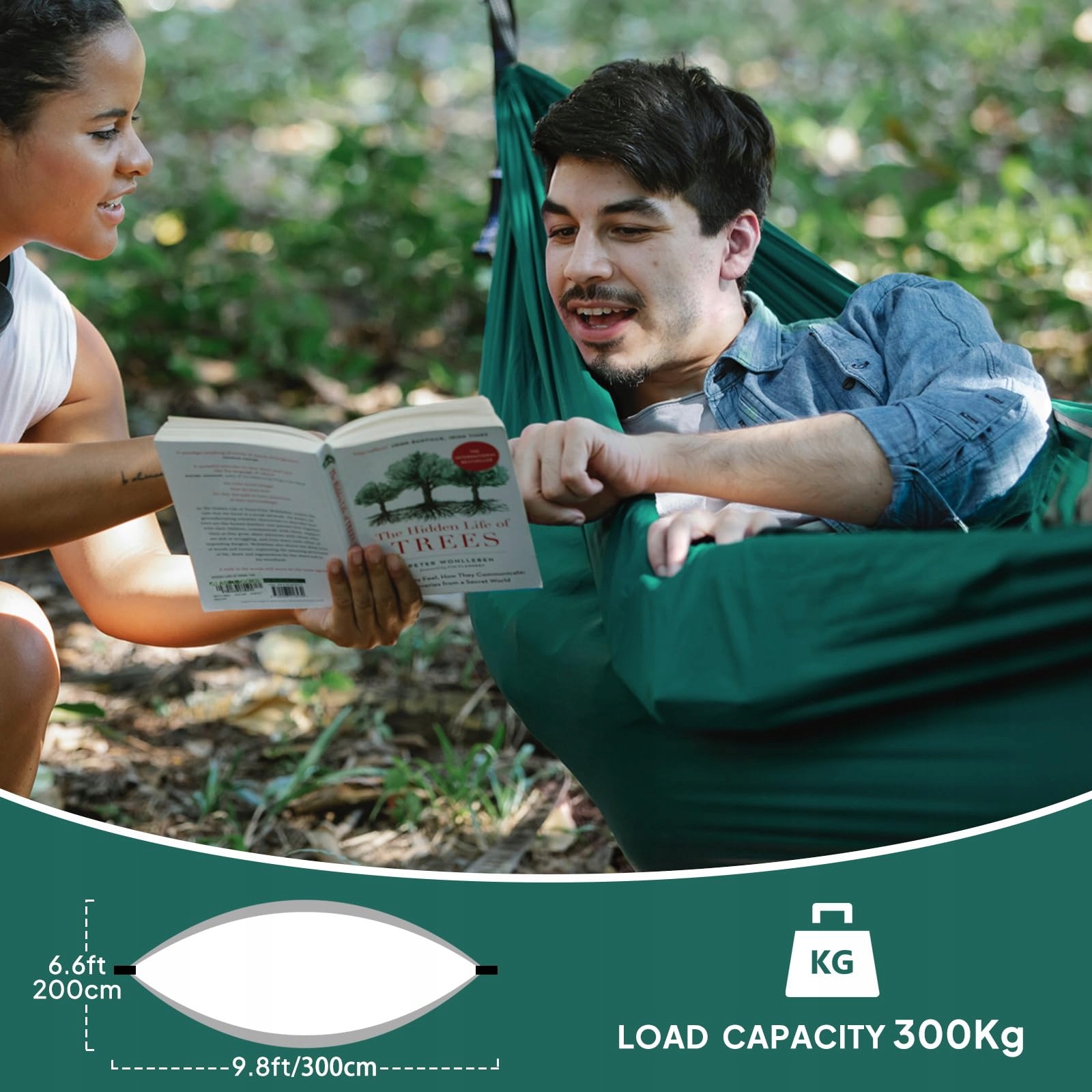 Wytrzymałość i ochrona drzew: Wykonana z nylonu spadochronowego 210T klasy wojskowej z potrójnymi szwami i specjalnie zaprojektowanymi, ultramocnymi nylonowymi paskami. Ma podwójną wytrzymałość na zerwanie i jest wystarczająco mocna, aby utrzymać ponad trzech przeciętnych dorosłych! Ma również duży rozmiar (300x200 cm) i można ją łatwo prać ręcznie. Wyposażone szerokie paski sprawiają, że jest bardziej stabilna i mocna, nigdy nie ześlizgnie się na ziemię i chroni drzewo przed uszkodzeniami.