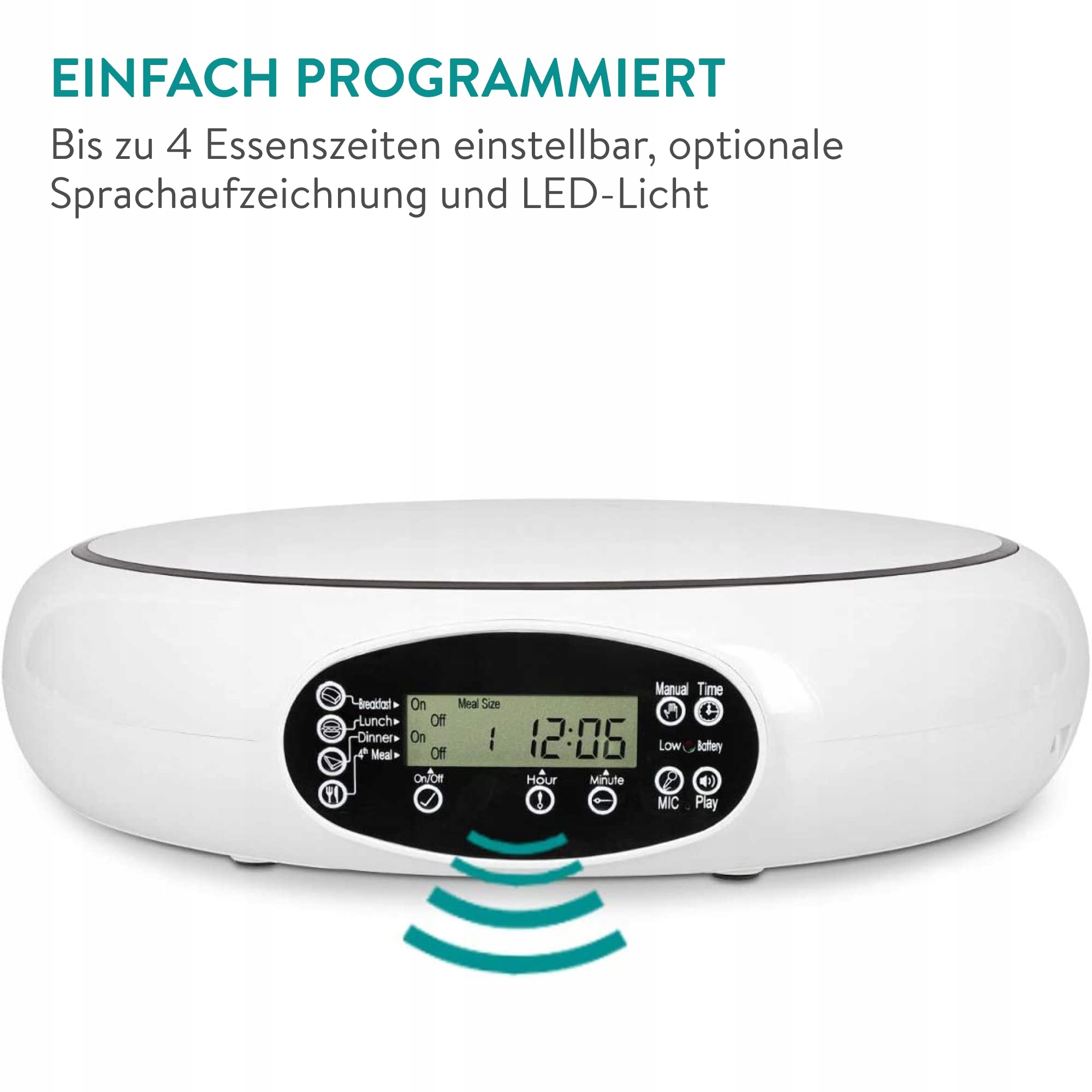 DESIGN SPOTYKA UŻYTECZNOŚĆ: Automatyczny podajnik karmy łączy nowoczesny design z praktycznymi zaletami. Czas posiłków można indywidualnie zaprogramować za pomocą wyświetlacza i dodać akustyczne powiadomienie.