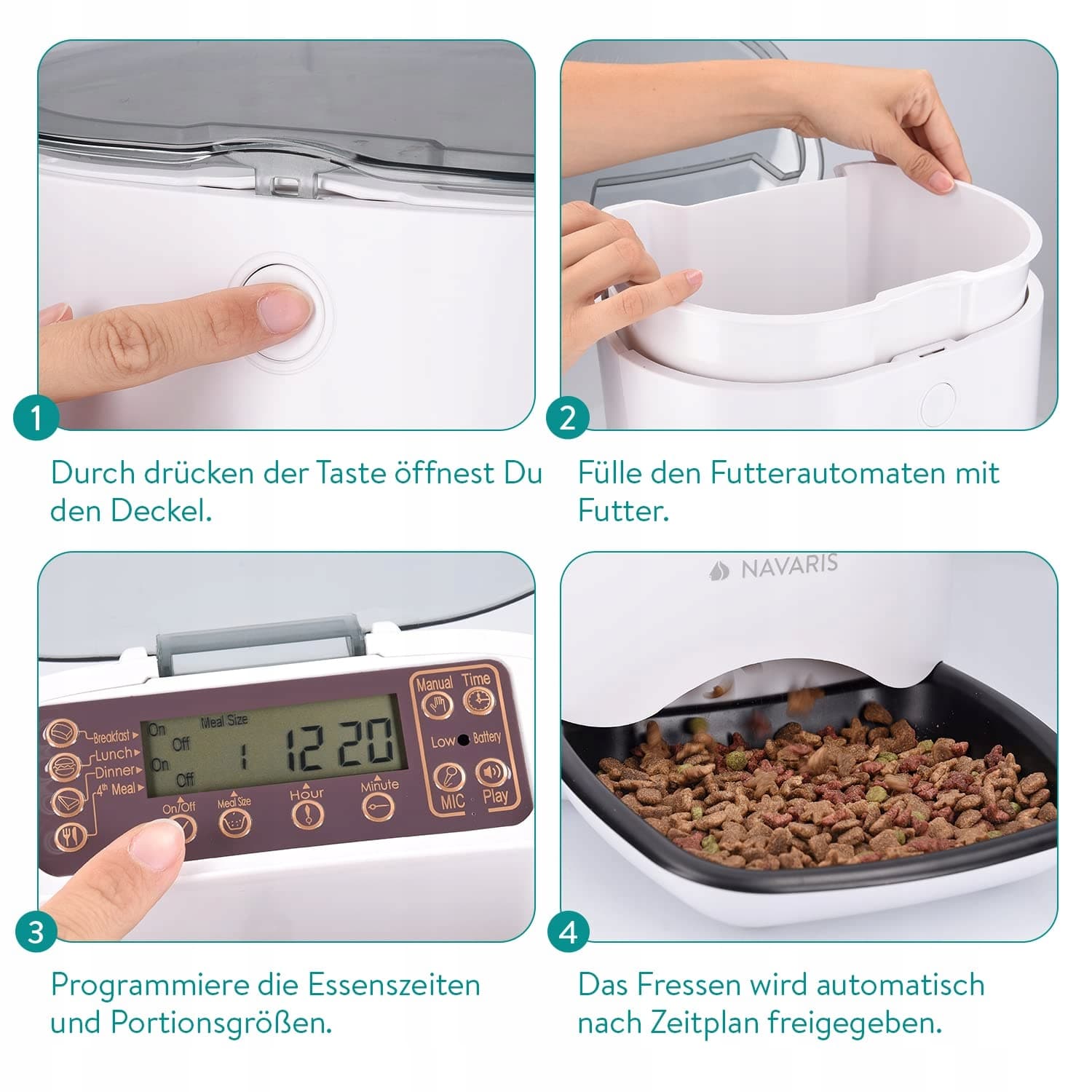 MAMY GŁÓD: Dzięki dozownikowi zapewnisz swojemu zwierzęciu regularne i punktualne karmienie suchą karmą - i to całkowicie automatycznie! Możesz ustawić do 4 posiłków z maksymalnie 39 porcjami na posiłek (min. 5g, max. 390g).