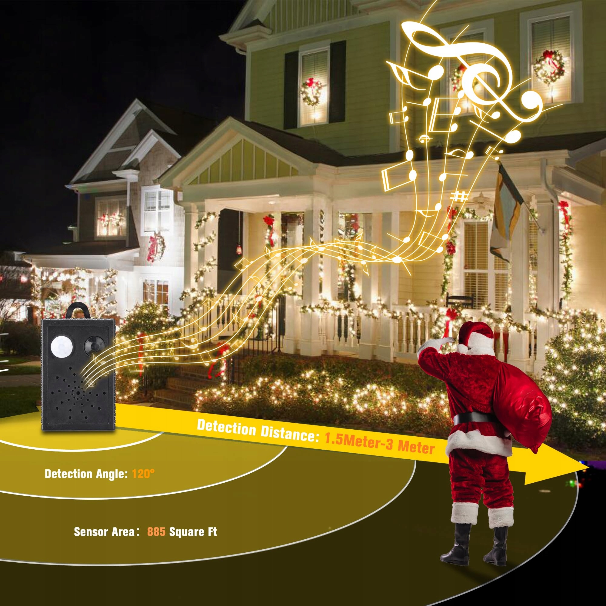 Czujnik ruchu: Czujnik ruchu naszego łańcucha świetlnego LED może wykryć każdy ruch, a następnie uruchomić oświetlenie i muzykę świąteczną. Gdy osoba wejdzie w obszar detekcji o kształcie sektora 90-100° (w odległości około 1.5M bez przeszkód), łańcuch świetlny natychmiast zacznie działać.
