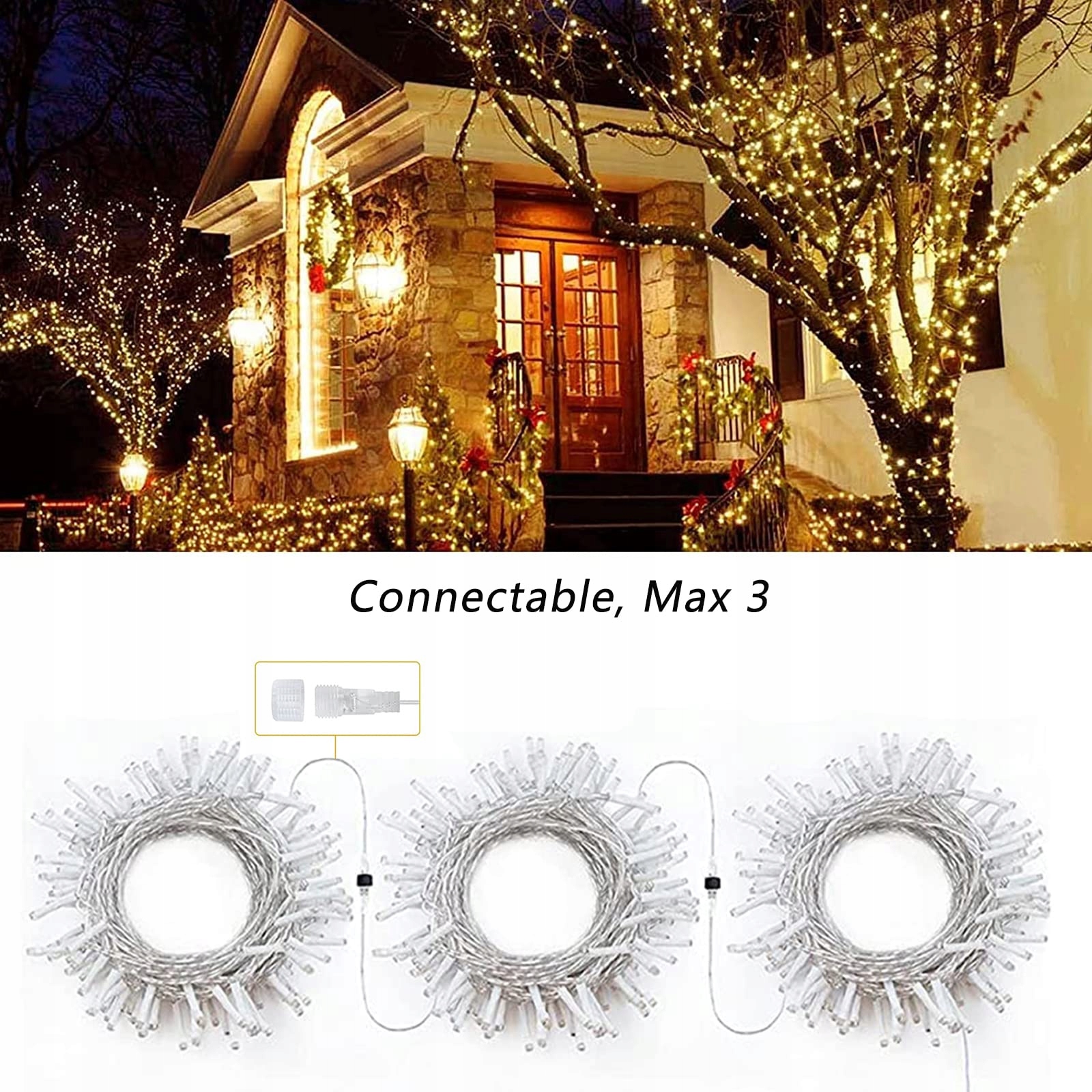 20M Oświetlenie Świąteczne Zewnętrzne: Zestaw 20M 200 LED łańcuch świetlny ciepła białe z wtyczką, 10CM odstęp między lampami, 3 metry kabla zasilającego, łącznie 23M. Łańcuch świetlny rozszerzalny, maks. 3 zestawy. (60M, 600 LED)
