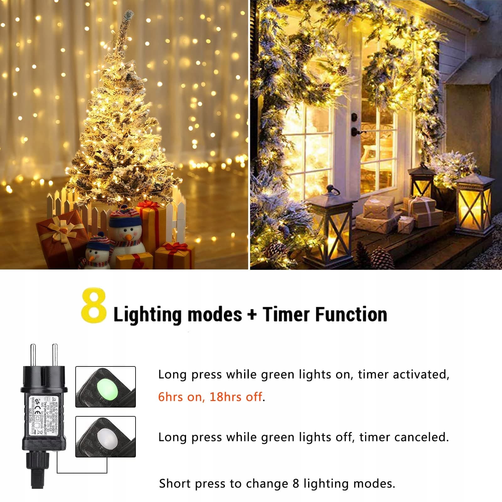 Funkcja Timera i Funkcja Pamięci: Przytrzymaj przycisk na adapterze przez 3 sekundy, lampka kontrolna świeci na zielono, a funkcja timera zaczyna działać (6 godzin włączone i 18 godzin wyłączone). Chip pamięci zapisuje ostatnie ustawienie trybu, więc nie musisz ustawiać trybu codziennie na nowo.