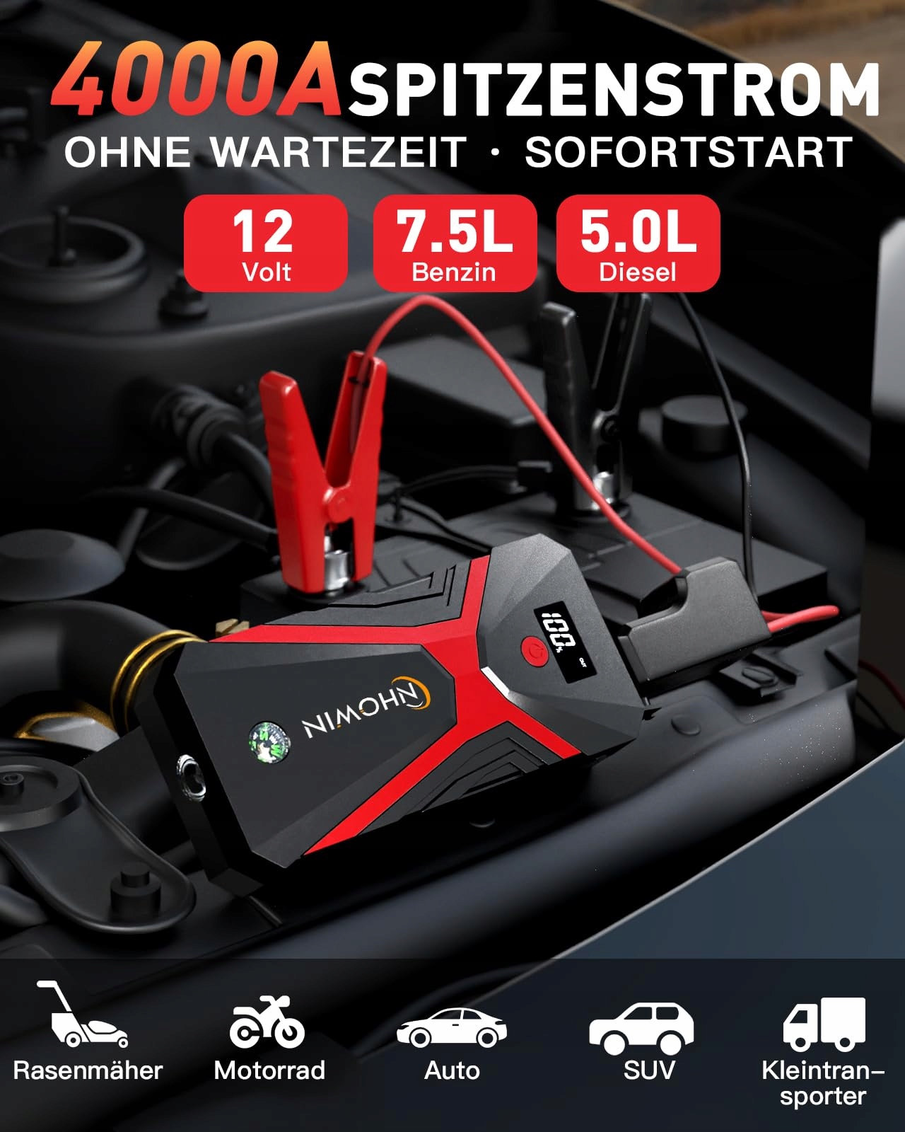 NHOWIN 4000A Powerbank rozruchowa do samochodów osobowych, funkcja 4 w 1, 12V powerbank rozruchowy do samochodu (do 7,5L benzyny lub 5,0L diesla) z kablem rozruchowym i lampą LED na sytuacje awaryjne na zewnątrz, zimę, podróże