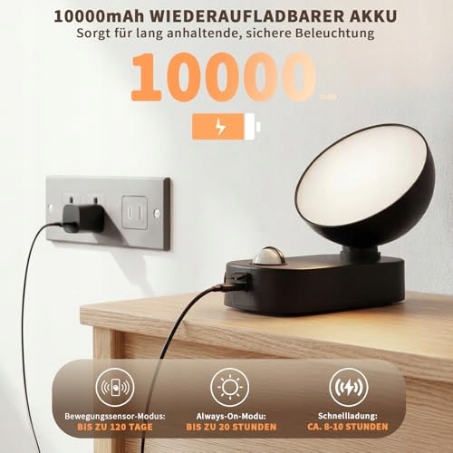 【Mega akumulator 10000mAh】Ta lampa zewnętrzna z czujnikiem ruchu jest wyposażona w wydajny, ładowalny akumulator 10000mAh. W trybie czujnika jedno ładowanie wystarcza na do 120 dni (przy około 10 aktywacjach dziennie). Koniec z ciągłą wymianą baterii! Pełne naładowanie przez kabel USB w zaledwie 6-8 godzin – z dowolnego gniazdka lub powerbanku