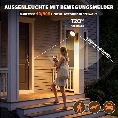 【3 tryby pracy】Wbudowany wysokoprecyzyjny czujnik ruchu wykrywa ruch do 6 m (120°). Ta lampa LED z czujnikiem ruchu na zewnątrz oferuje trzy tryby: 1. Światło ciągłe do pracy/tarasu; 2. Tryb czujnika dla wejścia; 3. Tryb automatyczny (włącza się po zmroku/wyłącza przy świetle) – idealny do oświetlenia ogrodu