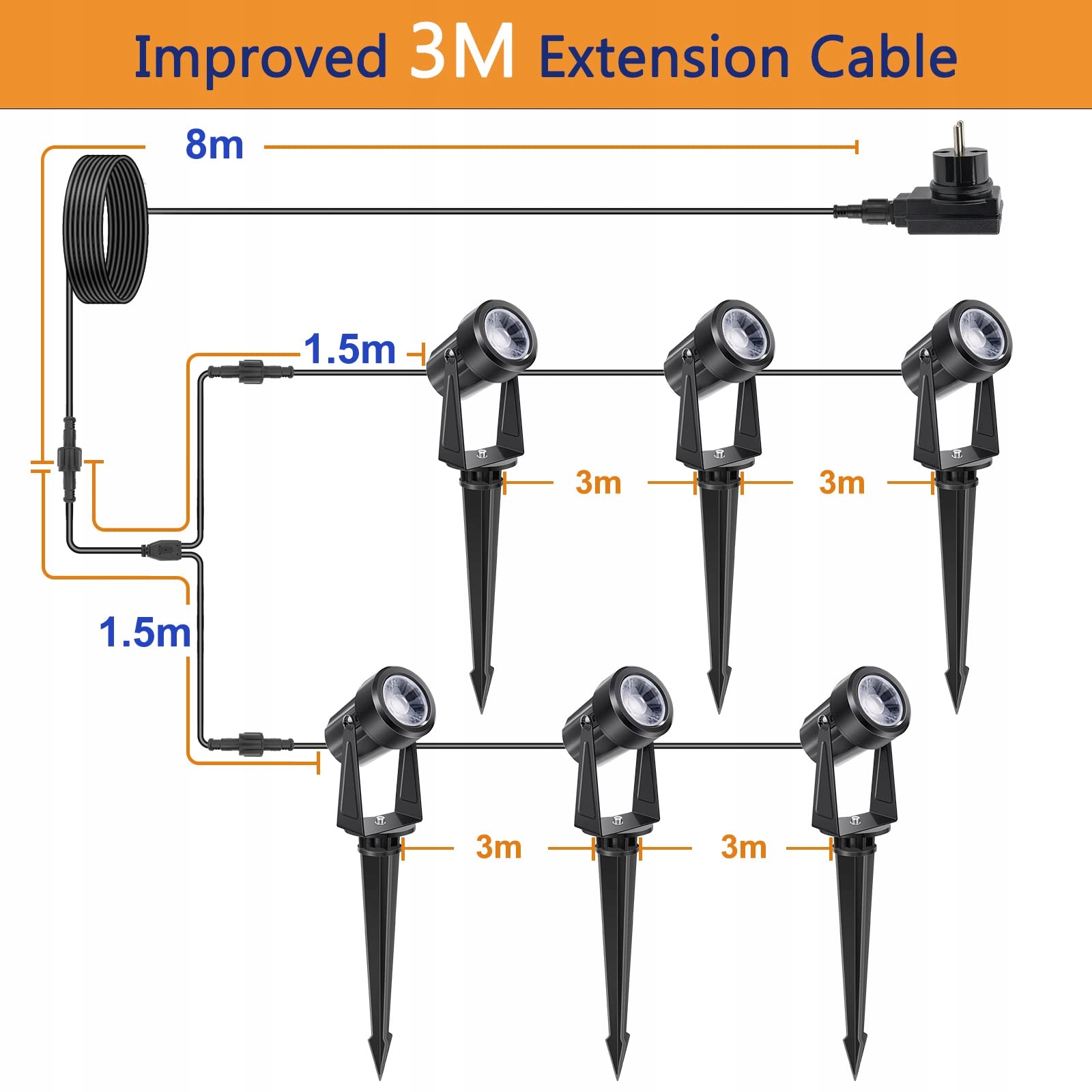 [23 Metry Długi Kabel] oświetlenie ogrodowe zawiera 6 reflektorów, 1 transformator i kable do szybkiego i pełnego pokrycia Twojego ogrodu. 9,5 m długości od wtyczki do pierwszego światła, 3 metry długości między światłami.