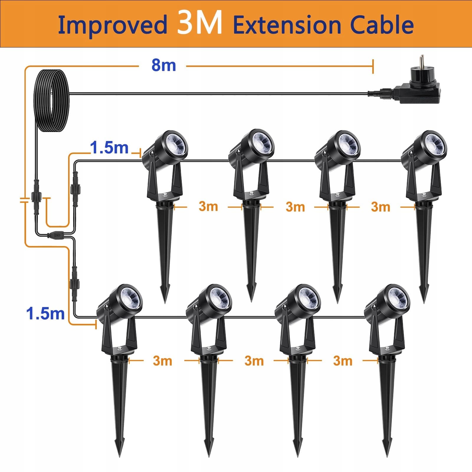 [29 Metrowy Kabel]Oświetlenie ogrodowe zawiera 8 reflektorów, 1 transformator i kable do szybkiego i pełnego pokrycia Twojego ogrodu. 9,5 m od wtyczki do pierwszego światła, 3 metry między światłami.