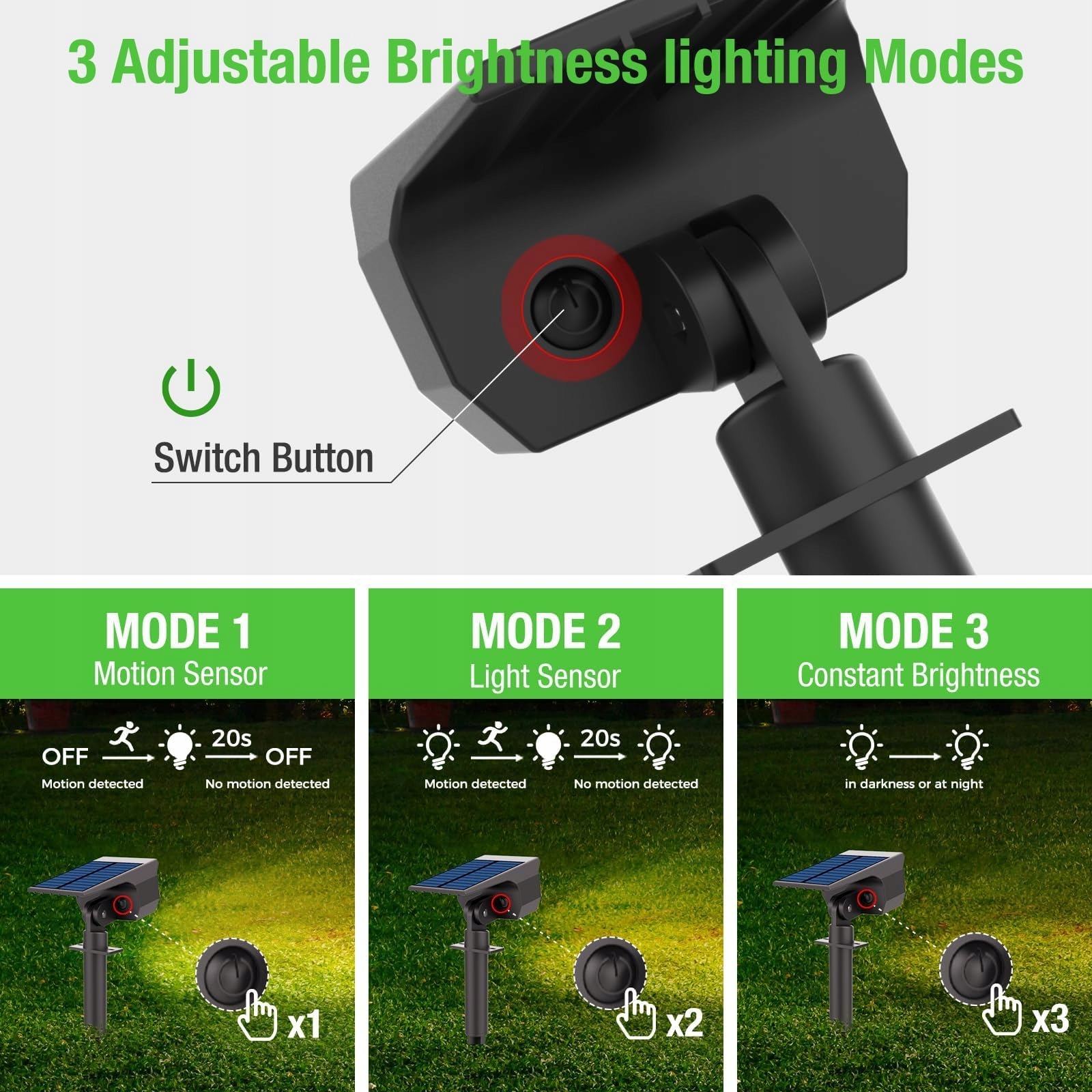 [Czujnik ruchu PIR i 3 tryby oświetlenia] Reflektory solarne mają wbudowany czuły czujnik ruchu PIR, który łatwo wykrywa ruchy. Są 3 tryby: 1.[Tryb stałego światła]: automatyczne włączanie w nocy, automatyczne wyłączanie w ciągu dnia. 2.[Tryb czujnika światła o niskiej jasności]: niska jasność bez ruchu, pełna jasność po wykryciu ruchu 3.[Tryb czujnika światła]: pełna jasność po wykryciu ruchu, wyłączenie bez ruchu