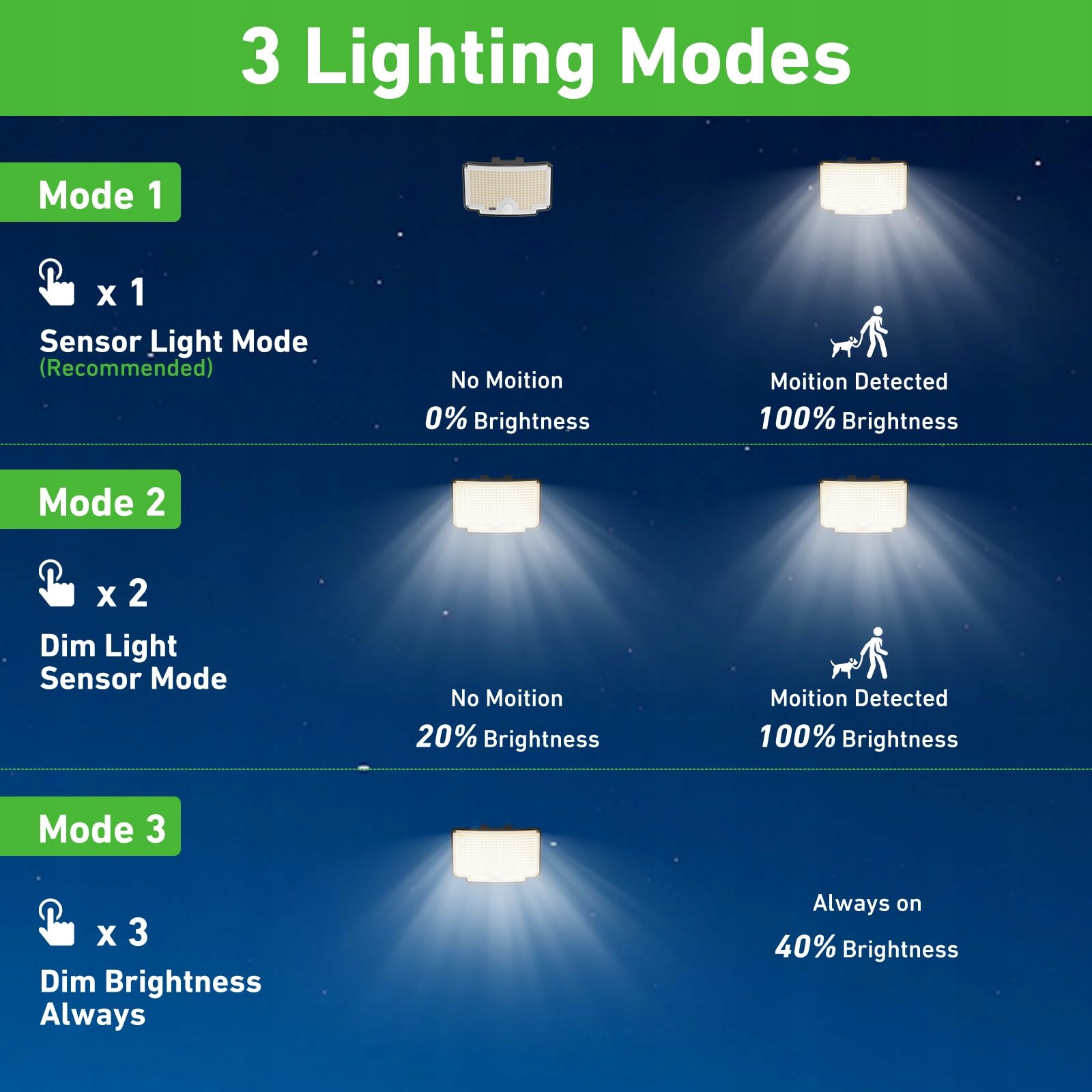 3 tryby i pilot: Wyposażony w pilot, obsługa jest prosta i wygodna. 3 różne tryby mogą lepiej spełniać Twoje potrzeby. Tryb 1, który świeci się stale, tryb 2, który zapala się, gdy wykryje ruch, oraz tryb 3, który jest bardziej energooszczędny