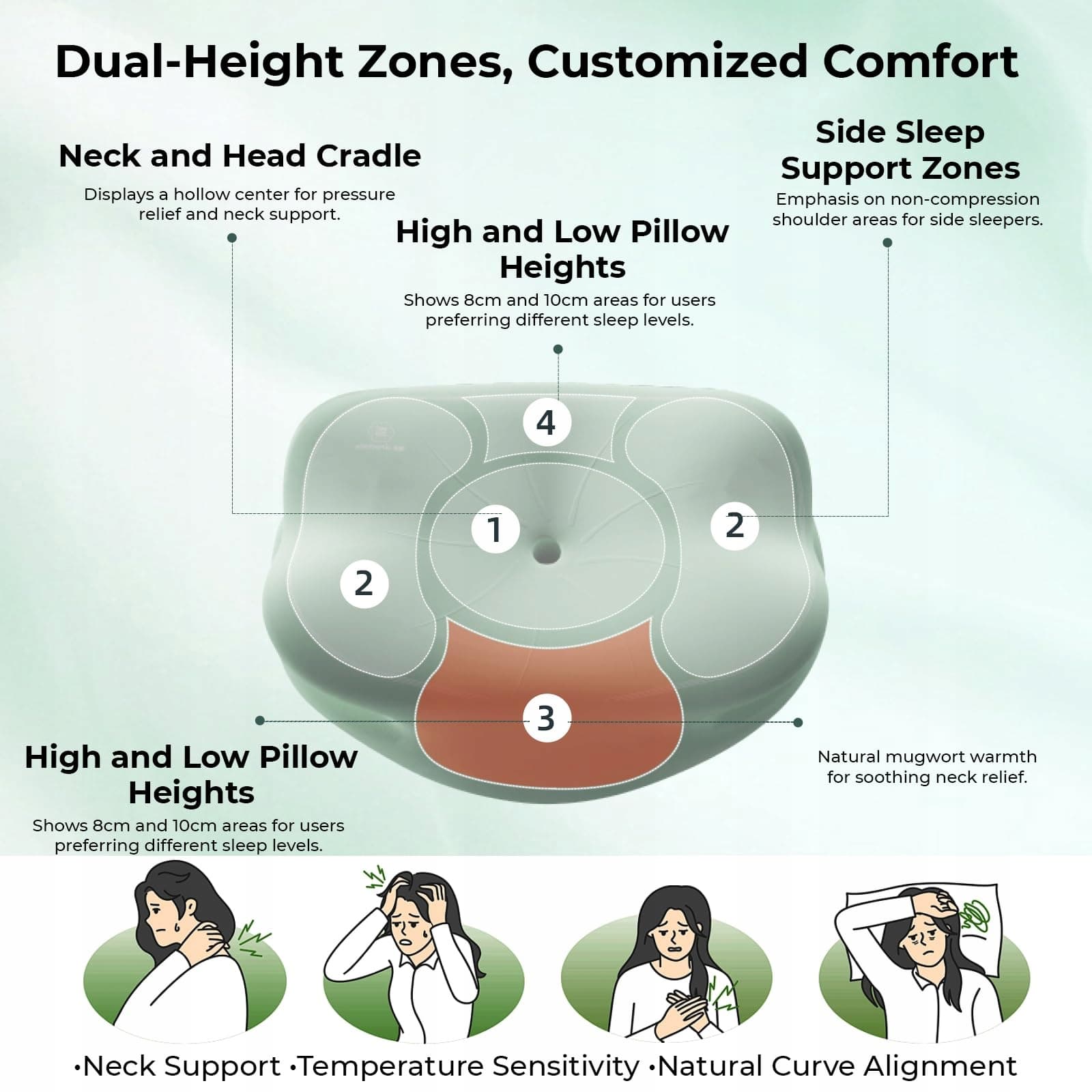 Podwójne strefy wysokości, indywidualny komfort: Dzięki podwójnym strefom wysokości ta poduszka na szyję oferuje dostosowany komfort, który odpowiada Twoim potrzebom. Niezależnie od tego, czy wolisz wyższe czy niższe wsparcie, nasza poduszka zapewnia optymalne ułożenie szyi i relaks.