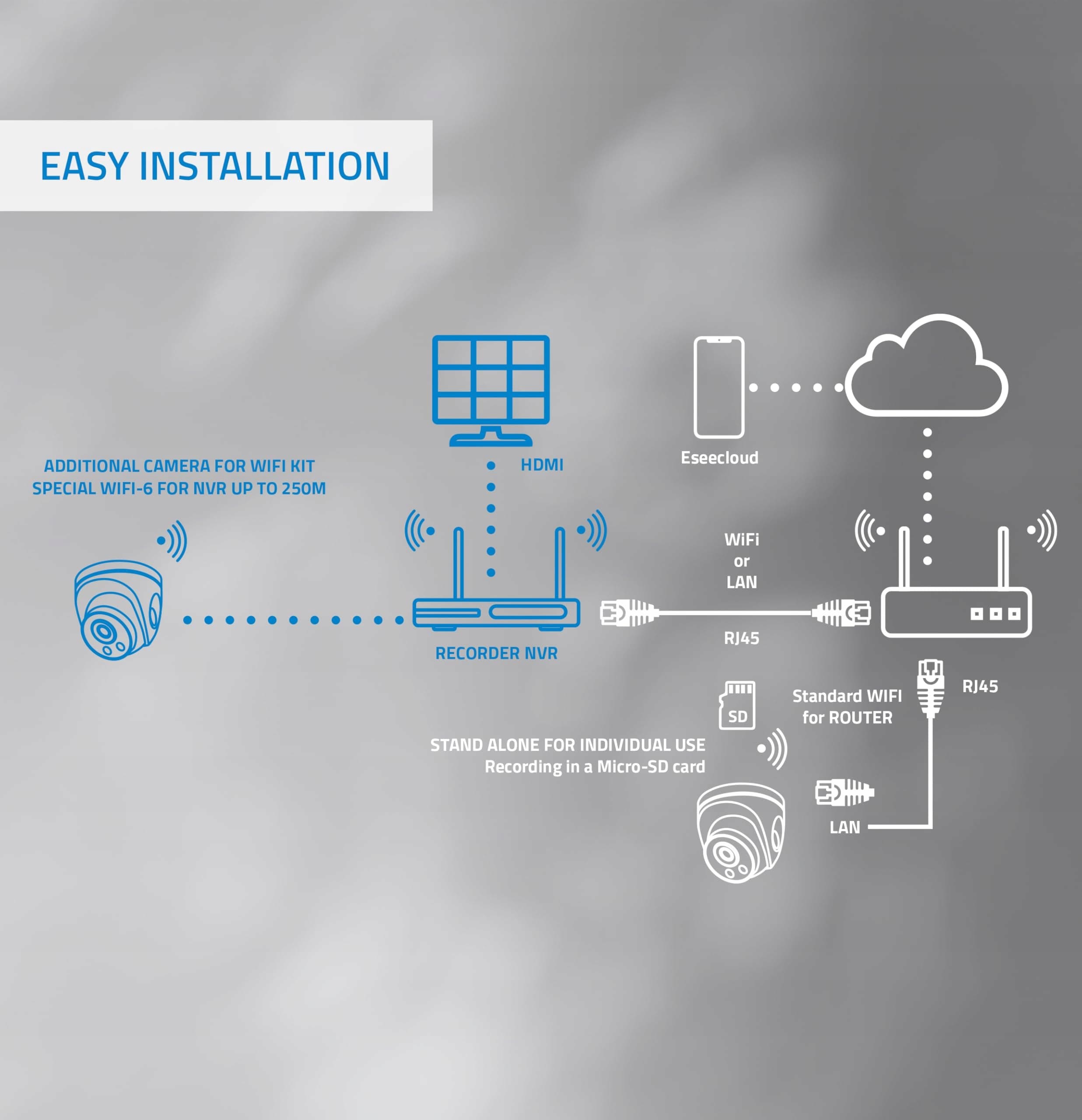 Kompaktowa konstrukcja do wnętrz z montażem sufitowym. Ta kamera została specjalnie zaprojektowana do montażu sufitowego i idealnie pasuje do każdego wnętrza. Instalacja jest prosta poprzez zeskanowanie kodu QR, a urządzenie oferuje opcje przechowywania na karcie MicroSD (do 256 GB, brak w zestawie) lub w chmurze EseeCloud (z abonamentem), umożliwiając przeglądanie nagrań z dowolnego miejsca.