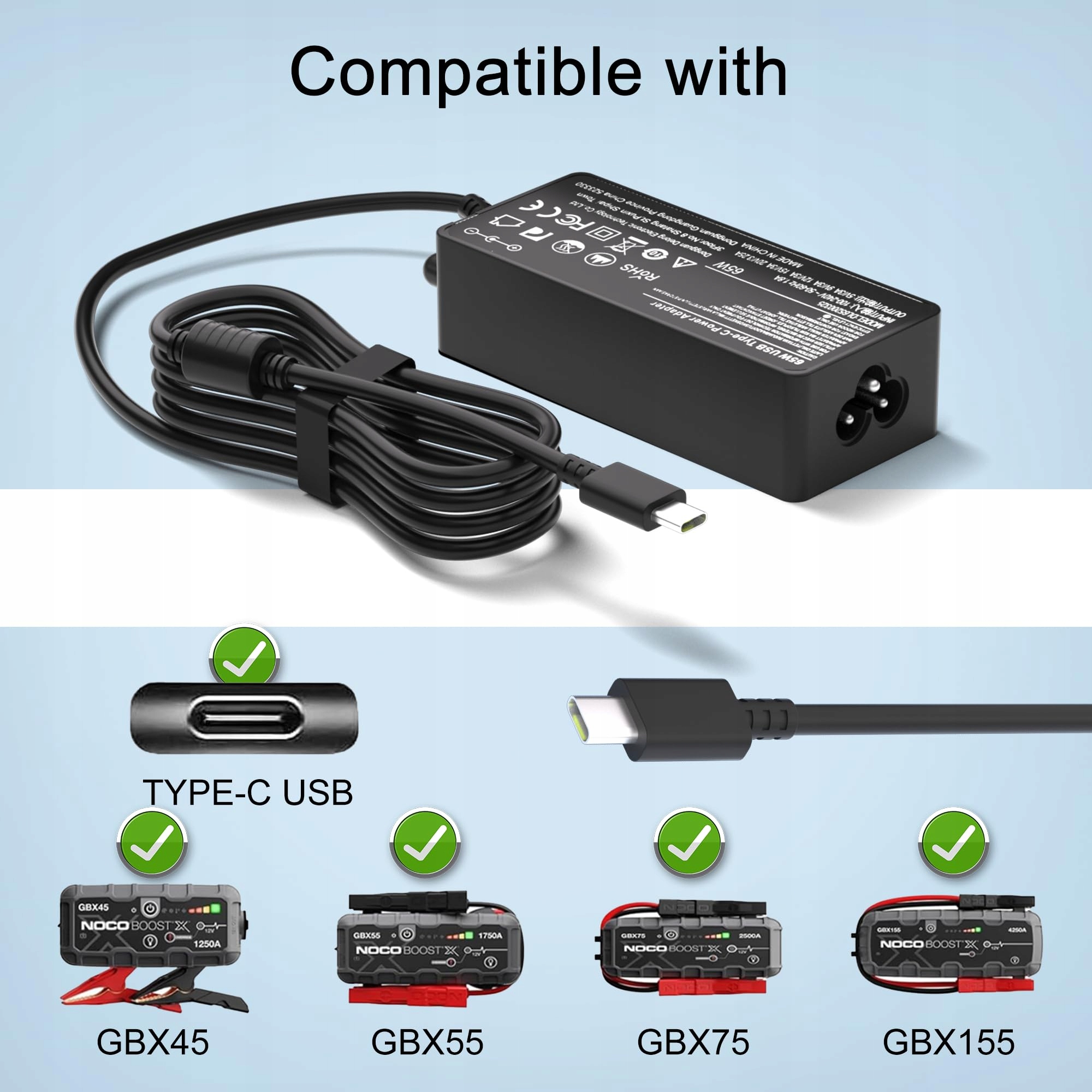 65W USB C NOCO GBC011 Adapter ładowarka do NOCO Boost Air AX65, NOCO Boost X GBX45 1250A GBX55 1750A GBX75 2500A GBX155 4250A UltraSafe przenośny rozruchowy typ C kabel zasilający