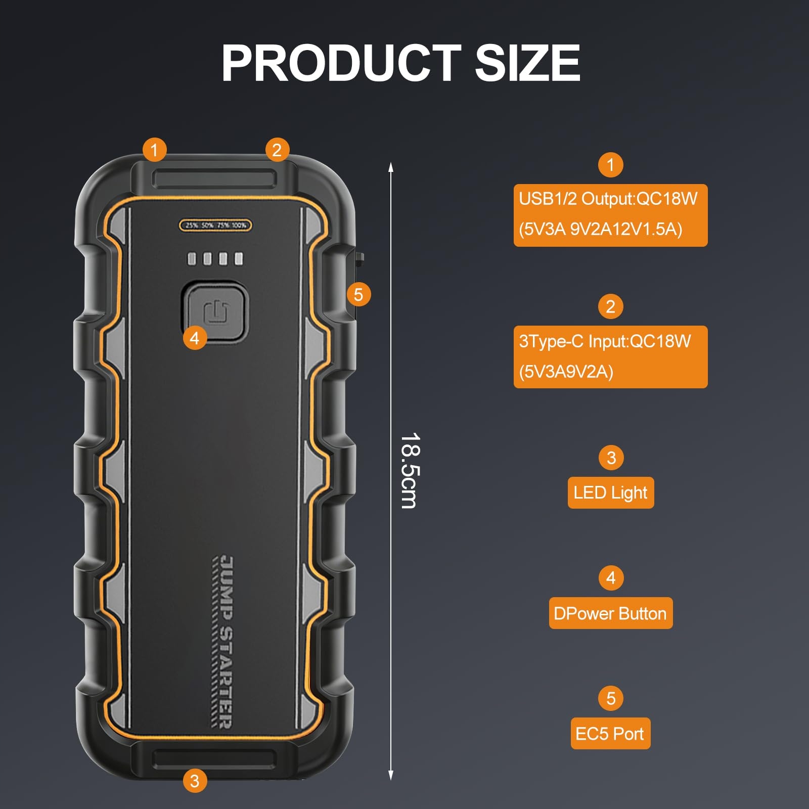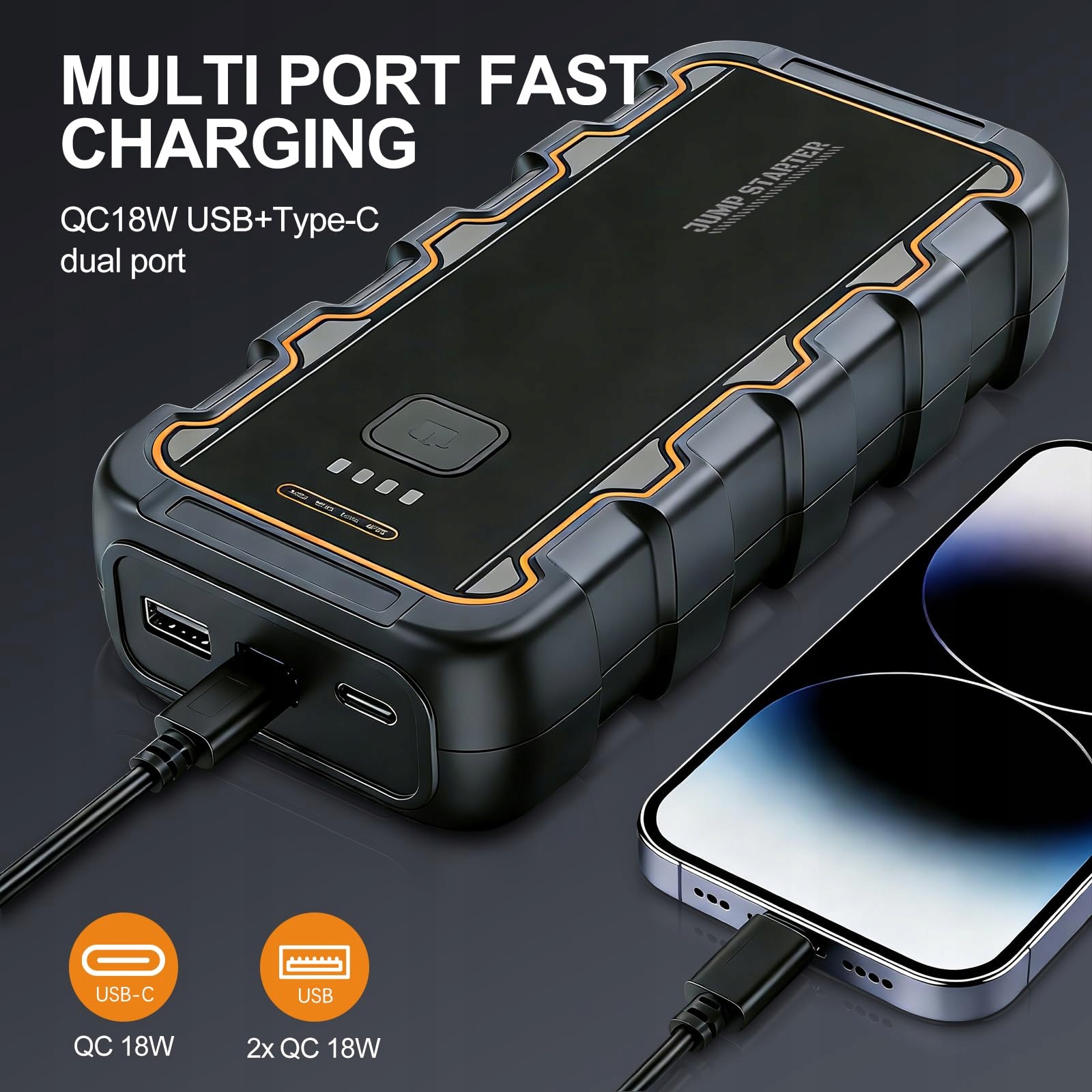 ✔ Wszechstronne zastosowanie: Z prądem szczytowym 7000 A! Kompatybilny z większością samochodów benzynowych i diesla 12 V, w tym silników benzynowych do 6,0 l pojemności i silników diesla do 4,5 l pojemności. Bez trudu radzi sobie z awaryjnym rozruchem popularnych modeli, takich jak samochody rodzinne, SUV-y i lekkie pojazdy użytkowe. Podczas biwakowania na świeżym powietrzu nie tylko wydłuża czas pracy baterii urządzeń elektronicznych, takich jak telefony komórkowe i tablety, ale także zasila urządzenia outdoorowe o niskim poborze mocy, takie jak lampy kempingowe, przenośne głośniki Bluetooth i mini projektory, wzbogacając tym samym Twoje doświadczenie podczas biwakowania.