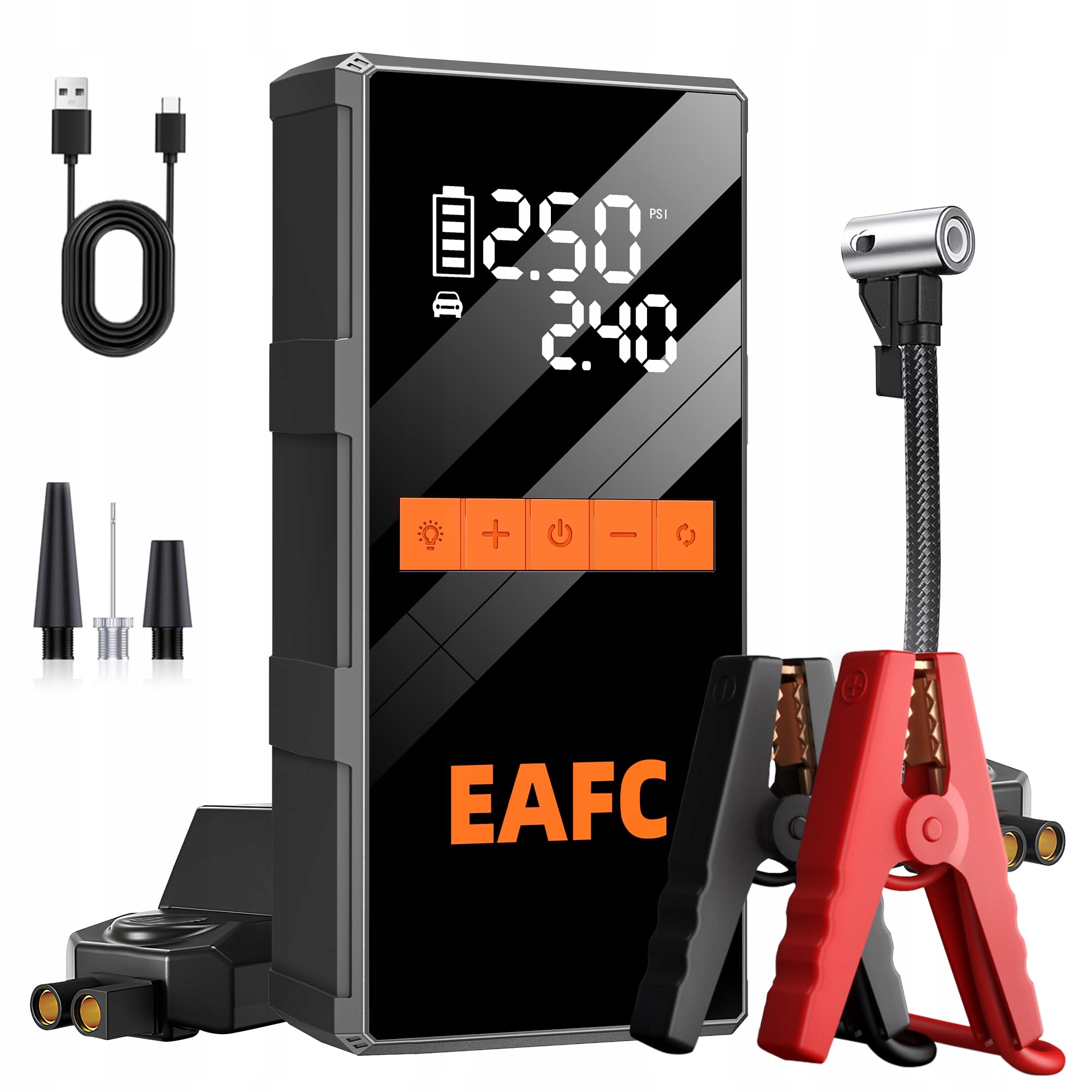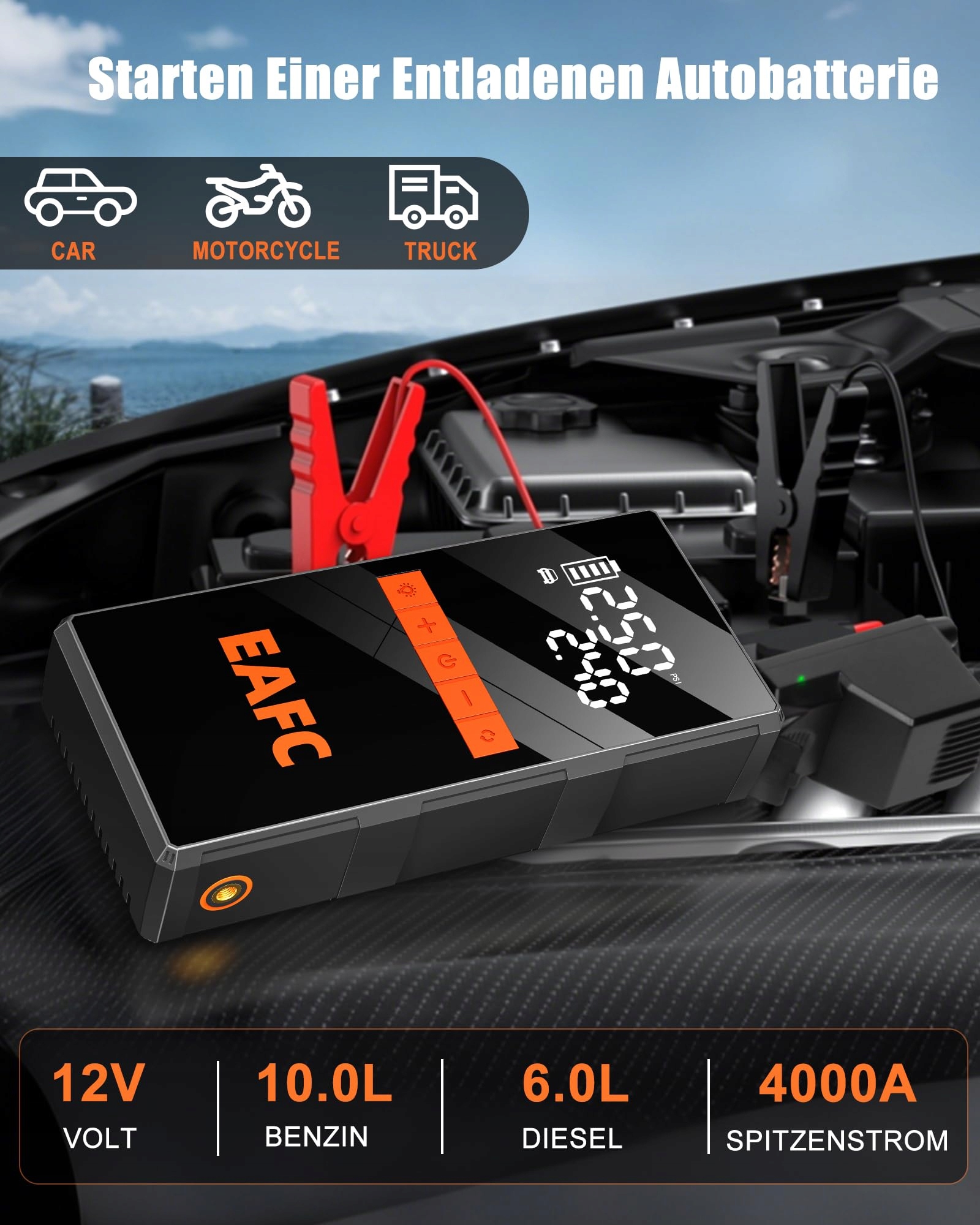 Wielofunkcyjne przenośne źródło zasilania: EAFC służy nie tylko jako rozruch do akumulatorów samochodowych, ale także jako przenośna powerbank i latarka LED. Przez port USB 5V/2A można ładować urządzenia mobilne, takie jak smartfony i tablety, w każdej chwili. Latarka LED oferuje trzy tryby (światło stałe, migające, sygnał SOS). Niezależnie od awarii na drodze czy przygód na świeżym powietrzu – zapewnia Twoje bezpieczeństwo.