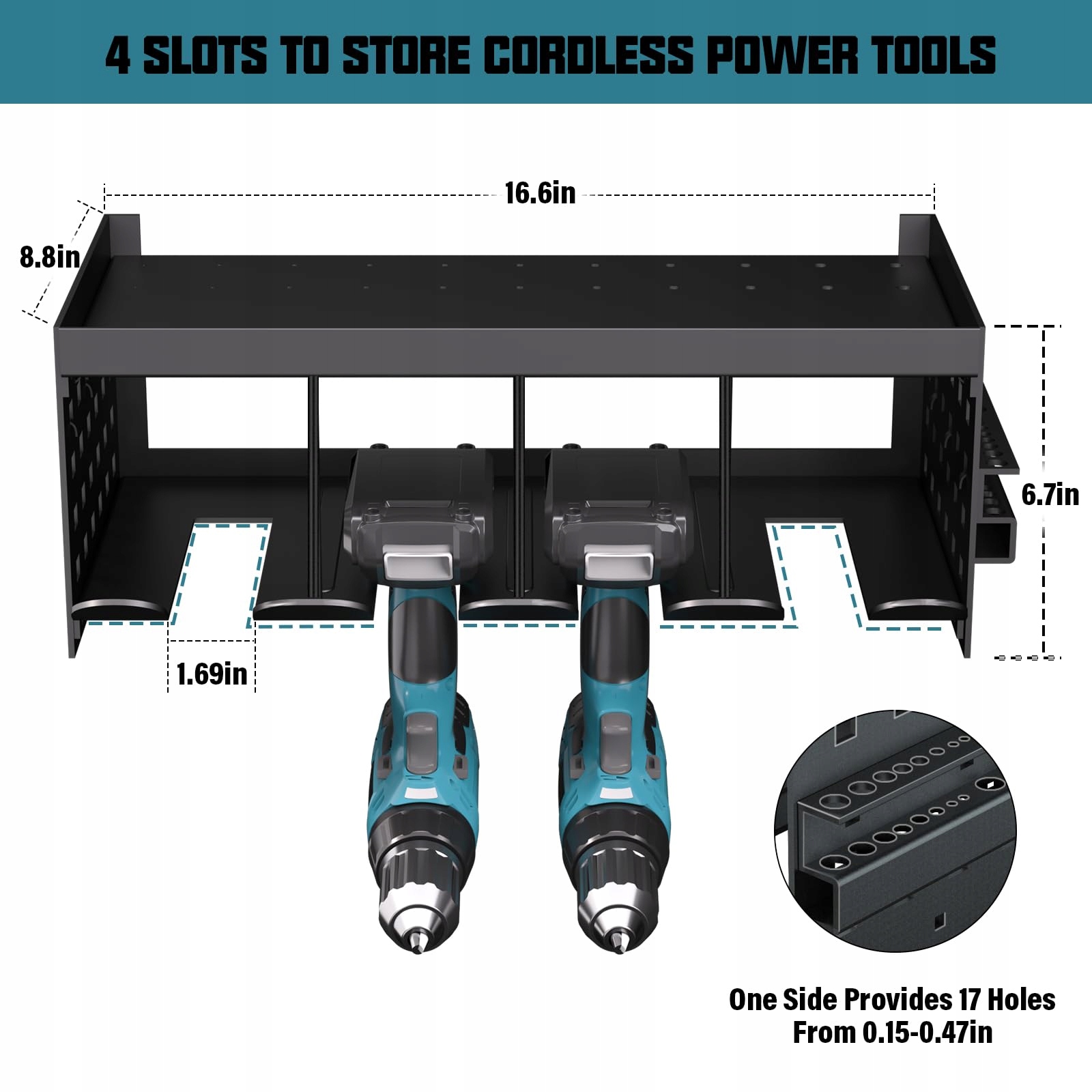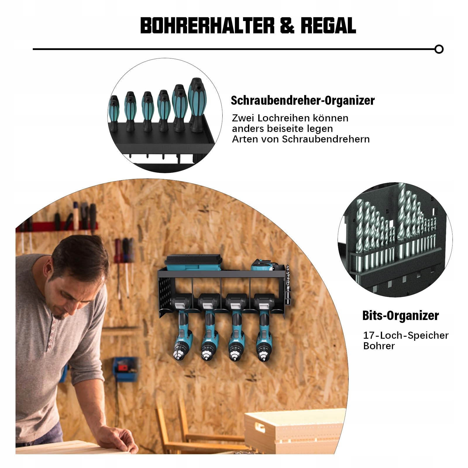 nomiou Magazyn narzędzi Przechowywanie Uchwyt na ścianę Akumulatorowy wiertarko-wkrętarka, 4 gniazda Heavyduty Wiertarka elektryczna montaż na ścianie Półka do przechowywania Organizacja wkrętaków Uchwyt na narzędzia