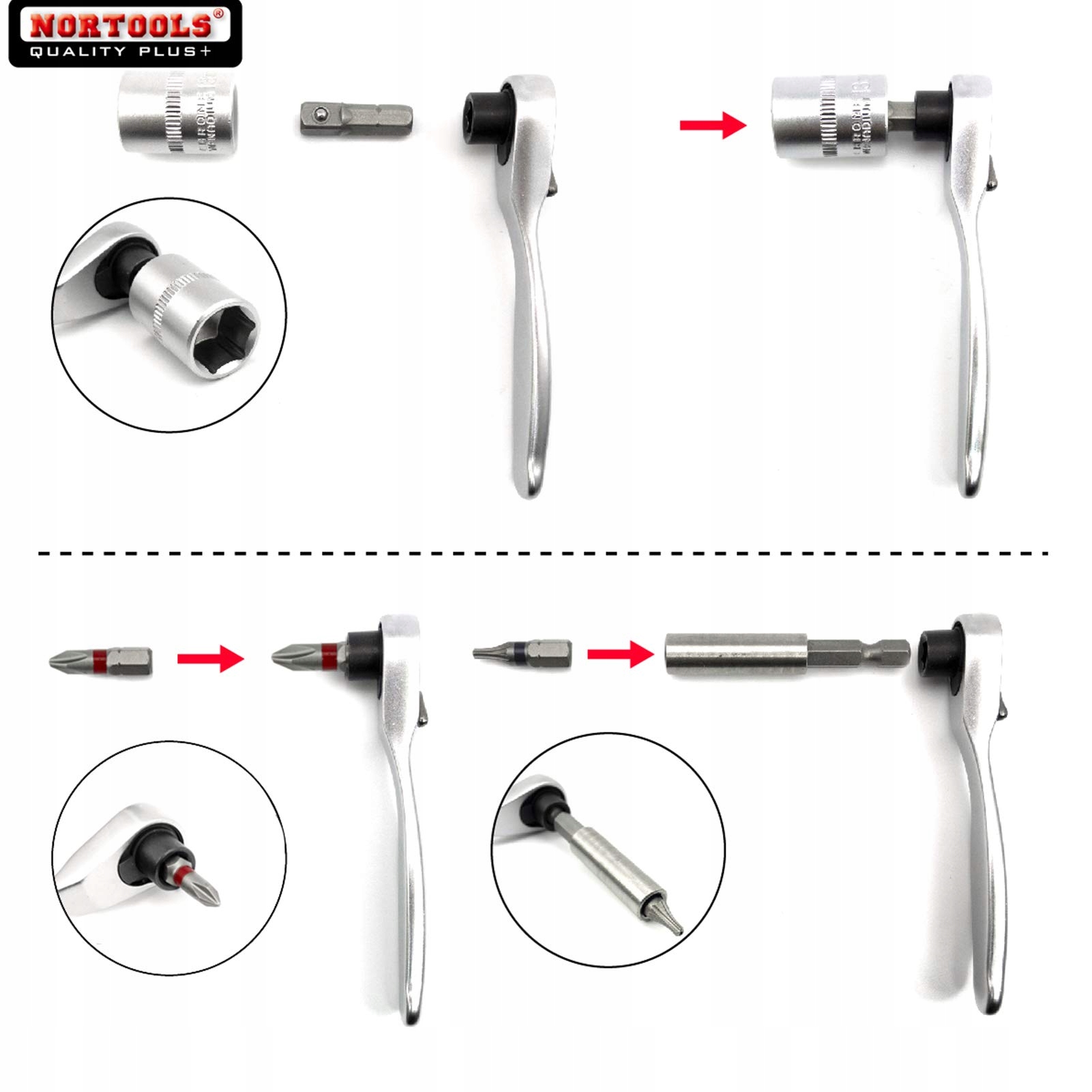 WSKAZÓWKI UŻYTKOWE - Gdy używasz bitów wkrętakowych, najpierw włóż nasadkę do klucza nasadowego. Gdy używasz gniazda, możesz po prostu włożyć je bezpośrednio do klucza nasadowego. Po pomyślnej instalacji możesz wygodnie wkręcać w prawo lub w lewo, jak chcesz