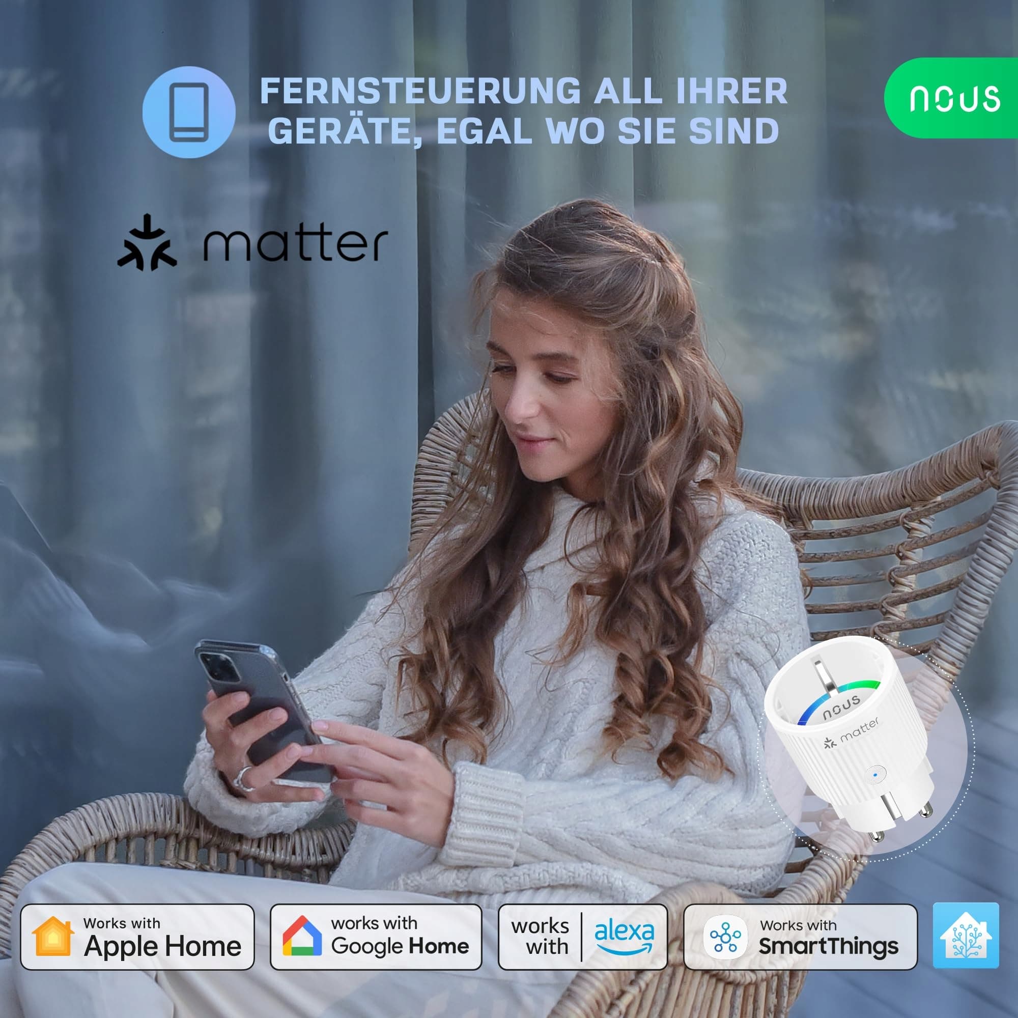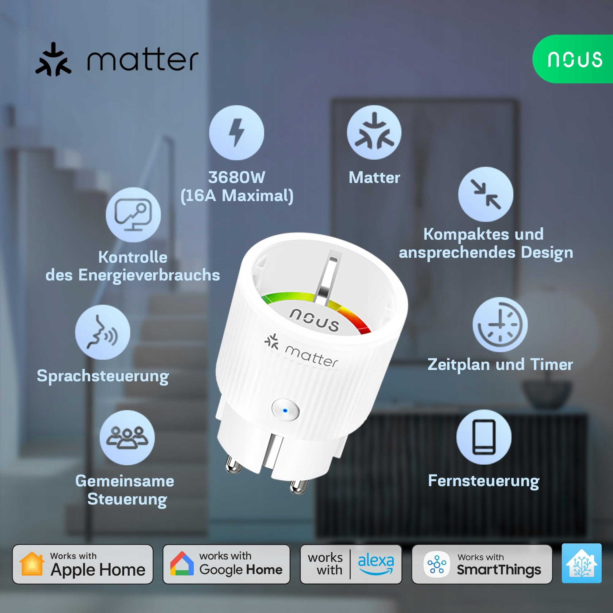 Gniazdko Smart NOUS Matter z pomiarem zużycia energii, 16A 3840W, kompatybilne z Alexą, Google Home, Tuya, Apple Home, Smart Things, zdalne sterowanie aplikacją, WiFi 2,4 GHz, IP20