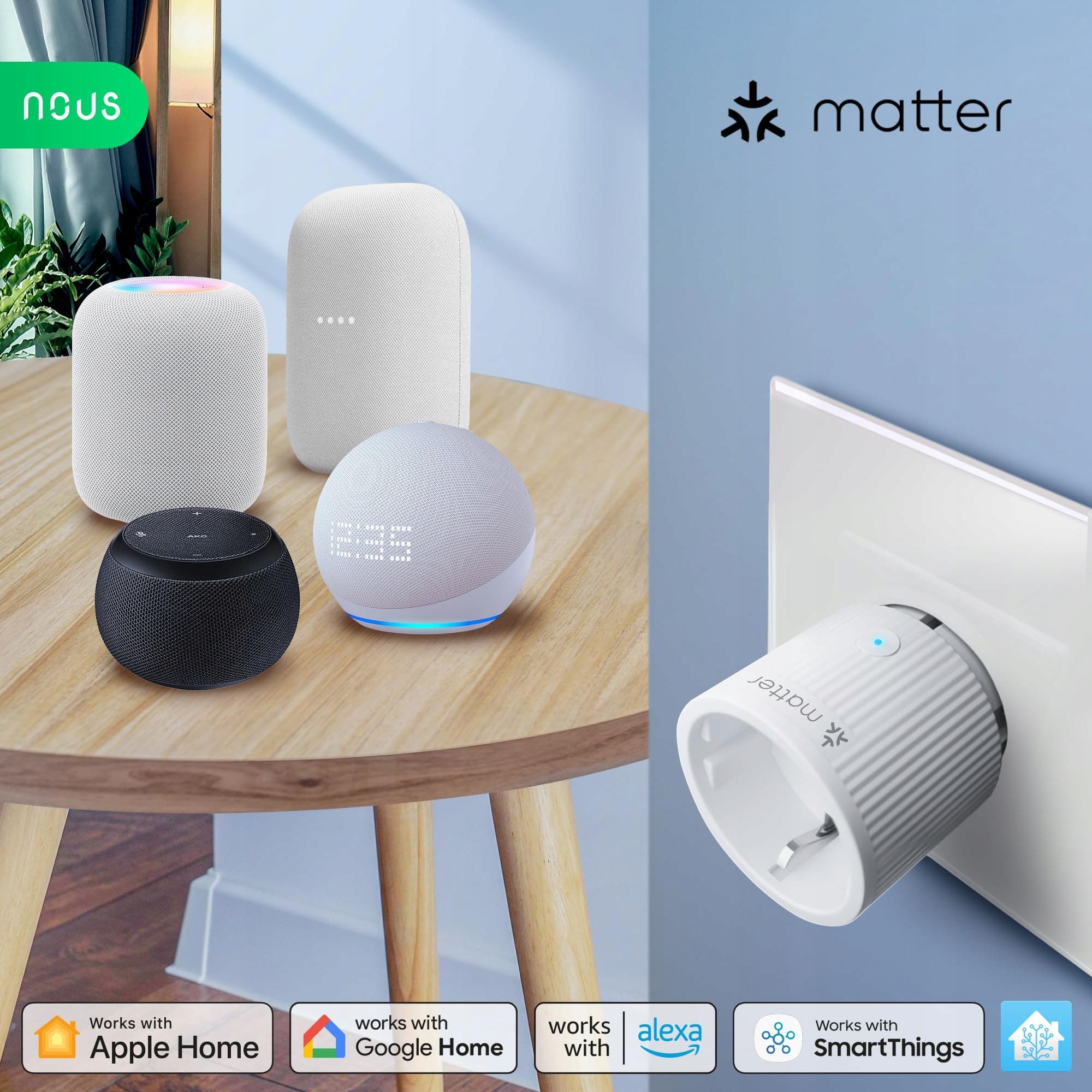 🌐 WSZECHSTRONNA KOMPATYBILNOŚĆ I PROTOKÓŁ MATTER: Nous A8M obsługuje połączenie WiFi 2,4 GHz i jest kompatybilne z Apple Home, Amazon Alexa, Google Home, Tuya Smart Life i SmartThings. Dzięki temu zapewnia szybkie i niezawodne połączenie, które umożliwia płynne sterowanie urządzeniami za pomocą różnych platform.